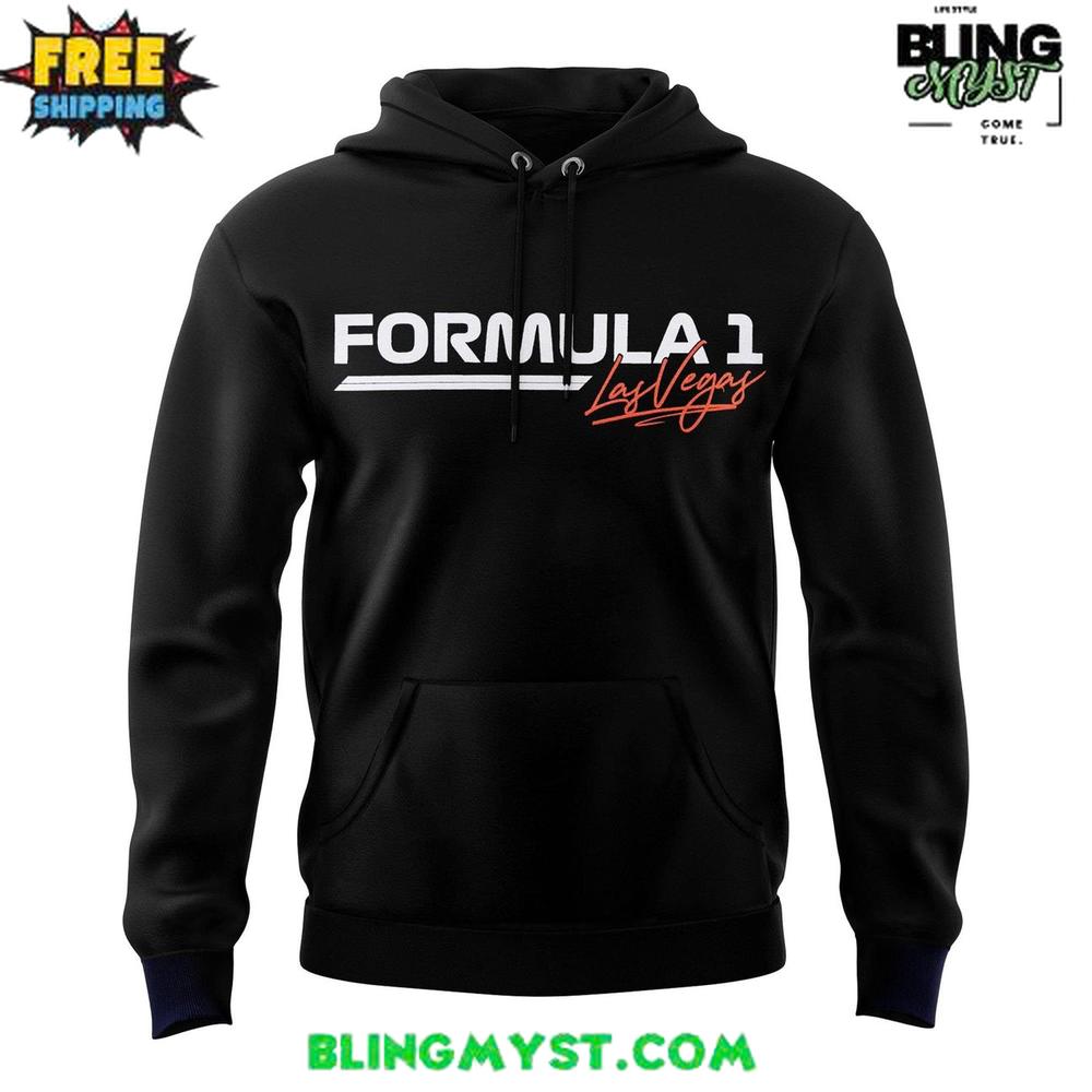 The 2025 Las Vegas Grand Prix Steering Hoodie delivers a sleek, race-ready aesthetic with its bold black base and striking red-orange F1-inspired graphics.