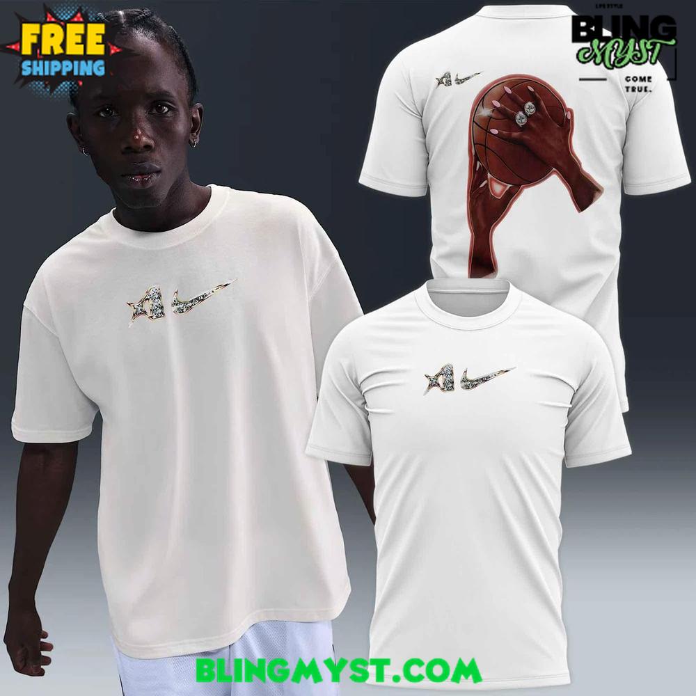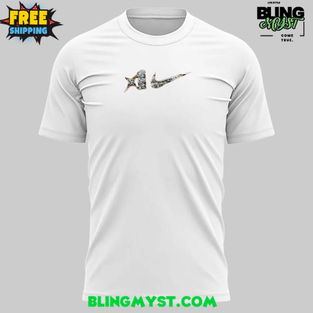 Front features the A’ja Wilson “A” emblem paired with the iconic Nike Swoosh, accented with glittering textures for subtle shine.