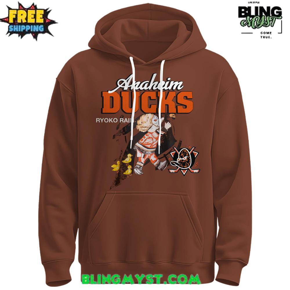 • The Anaheim Ducks Ryoko Rain Retro Streetwear Edition Hoodie brings a bold, vintage-inspired look to life with its rich brown backdrop and playful illustrated character graphic.