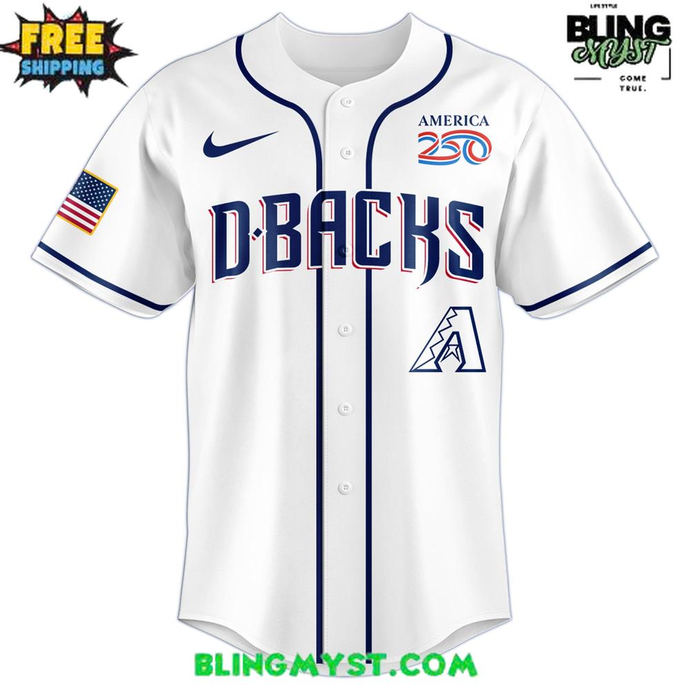 The Arizona “250th USA of America” Baseball Jersey (shown here in a Diamondbacks-style layout) is a bold attempt at fusing commemorative Americana with modern team branding, and it lands with striking clarity. The foundation is a crisp white base—clean, timeless, and instantly “baseball”—while the sharp navy piping along the button placket and sleeve cuffs adds a tailored sense of structure. This piping acts like visual discipline, keeping the jersey feeling premium and uniform-grade even as the graphics lean celebratory.