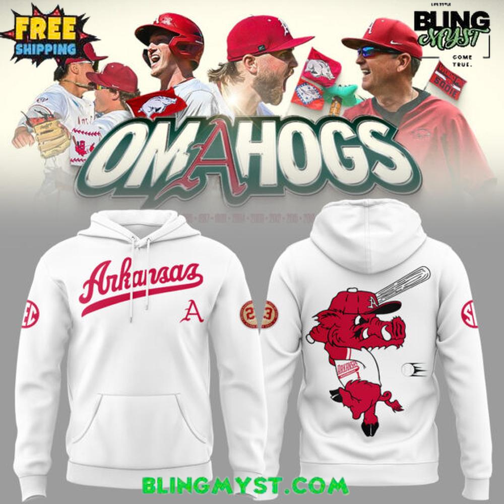 Gear up for the road to Omaha with the Arkansas Razorback OMAHOGS 2026 Hoodie, the ultimate layer for the dedicated Diamond Hogs fan. This crisp white pullover features the classic “Arkansas” script in cardinal red on the chest, anchored by the university’s iconic “A” logo. The back showcases a dynamic, high-energy illustration of the Razorback mascot swinging for the fences, symbolizing the team’s relentless pursuit of the 2026 title.