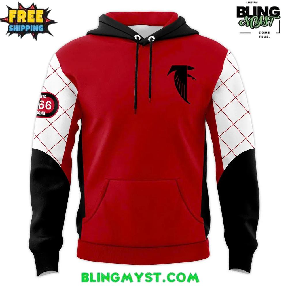 Features a striking red-and-black hoodie design with a sharp Falcons logo on the chest for instant visual impact.