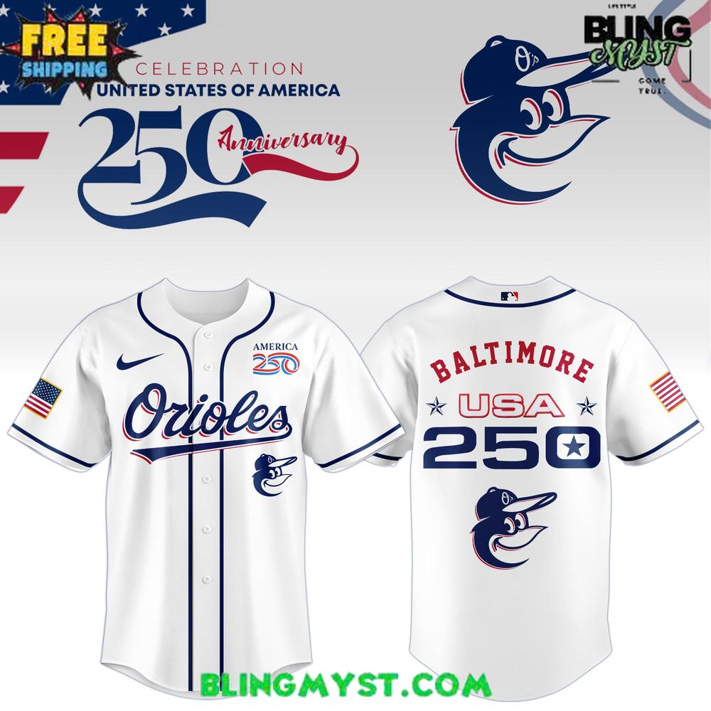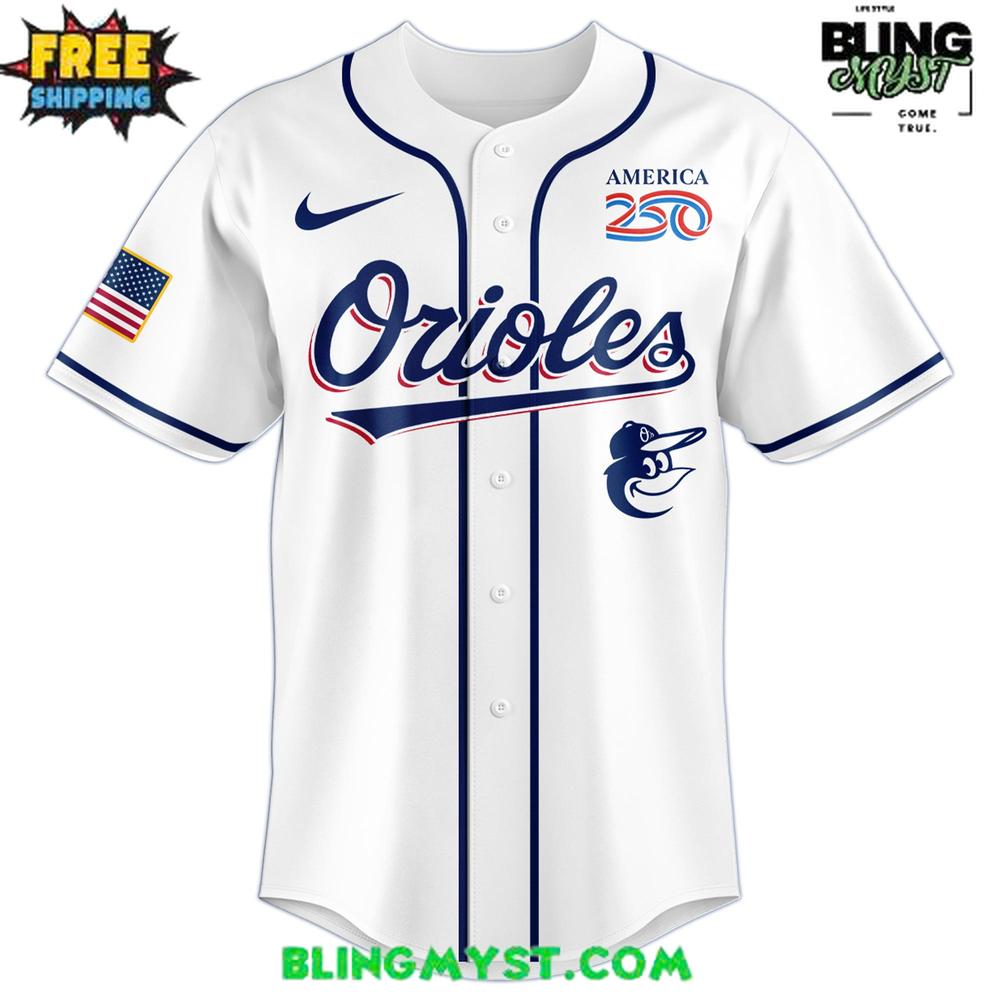 The Baltimore Orioles 250th USA of America Baseball Jersey is a thoughtful piece of commemorative fanwear that balances heritage, patriotism, and a distinctly Orioles identity with clean design discipline. It begins with a crisp white base—timeless, bright, and unmistakably “baseball”—then sharpens the silhouette using structured navy piping down the button placket and around the sleeves. This piping isn’t just trim; it adds architecture, giving the jersey a uniform-grade sense of polish that elevates it beyond typical event merch.