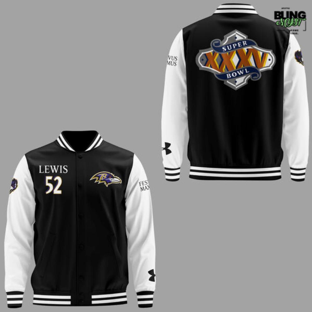 The Baltimore Ravens Lewis 52 SuperBowl XXXV Varsity Jacket brings bold sports energy and classic varsity craftsmanship together in one standout piece.