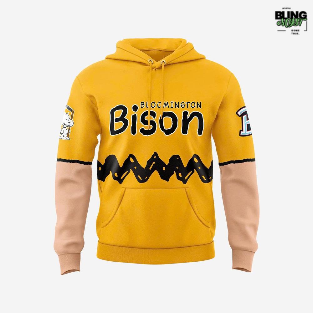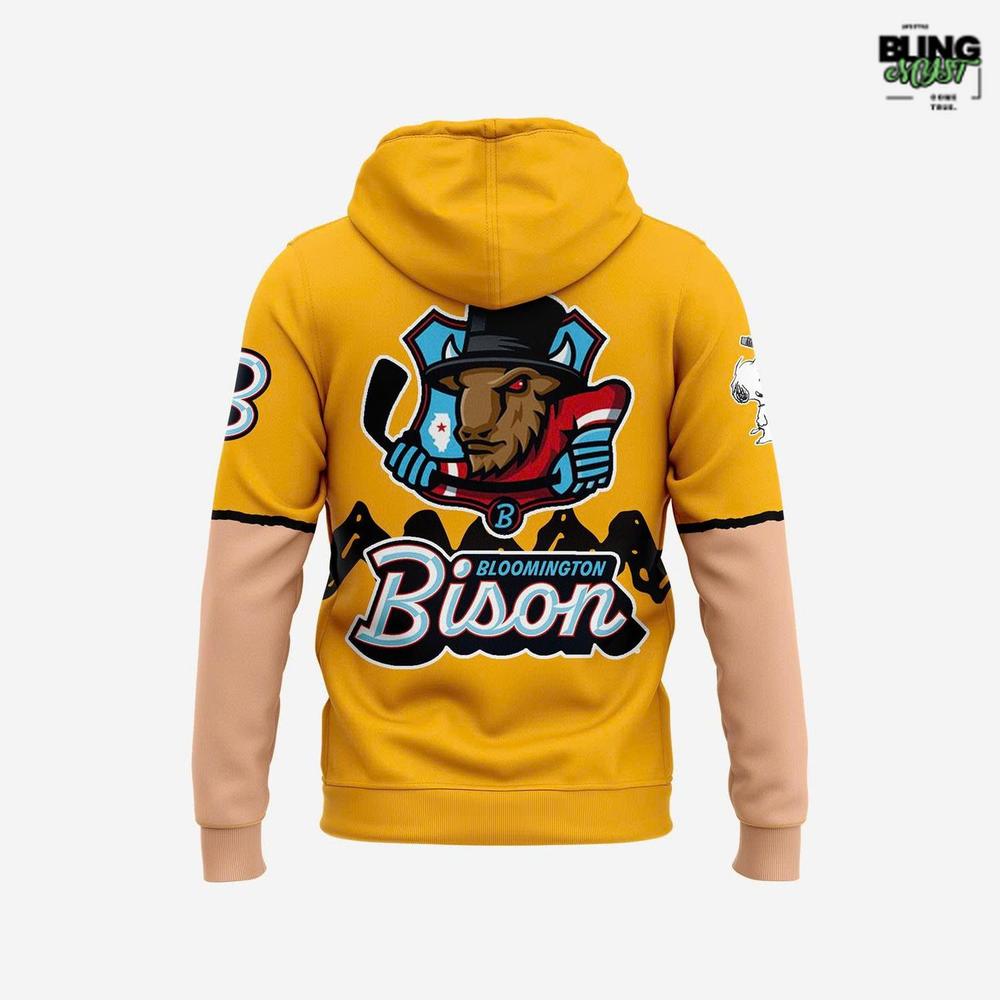 - Front design displays the Bloomington Bison name in playful lettering, while subtle Snoopy graphics add timeless charm.