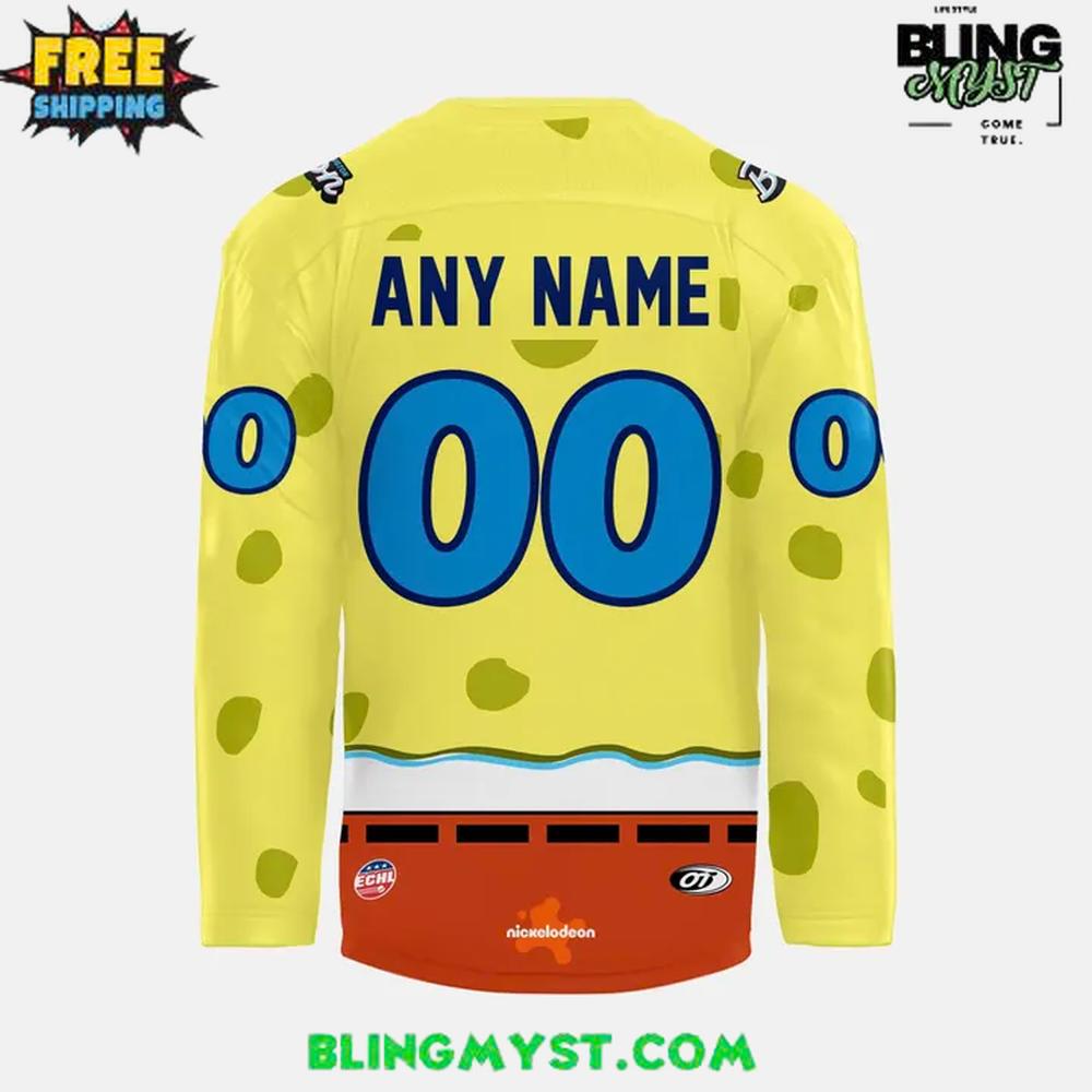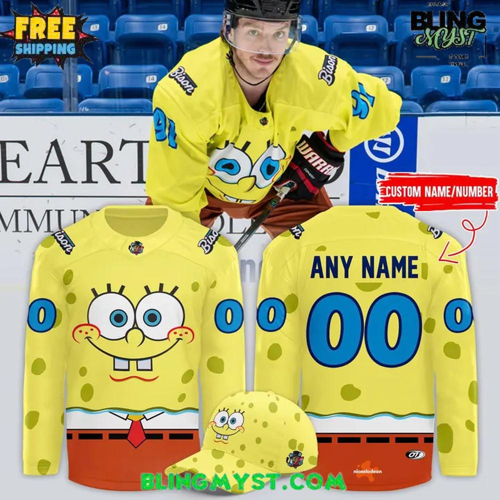 The Bloomington Bison x SpongeBob 2025 Hockey Jersey brings pure cartoon energy to the rink, blending bold hockey tradition with one of the most recognizable characters of all time.