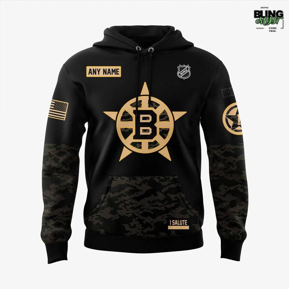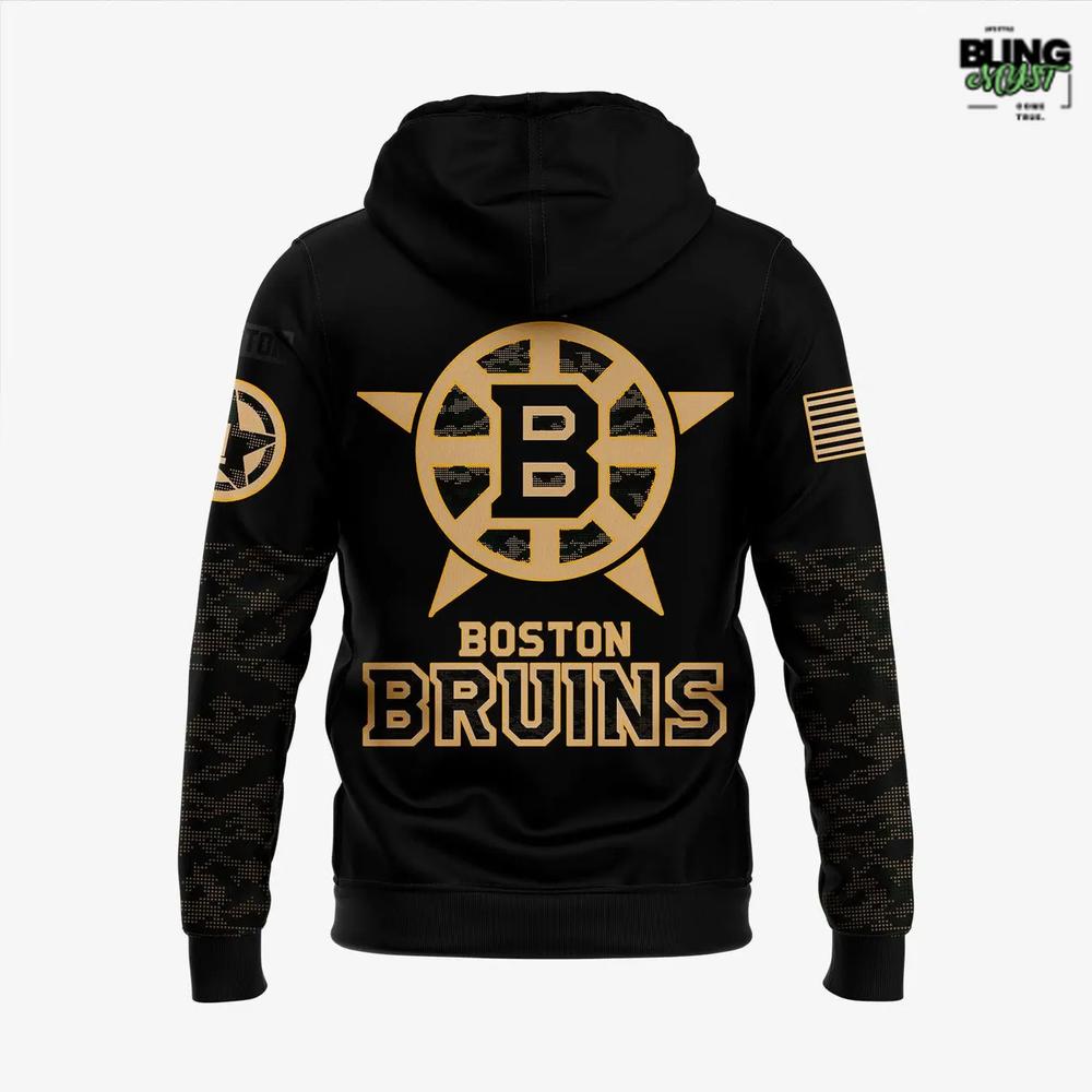 The Boston Bruins Military Appreciation Night 2025 Hoodie delivers a powerful mix of team pride and military-inspired style, wrapped in a sleek black-and-gold tribute design.