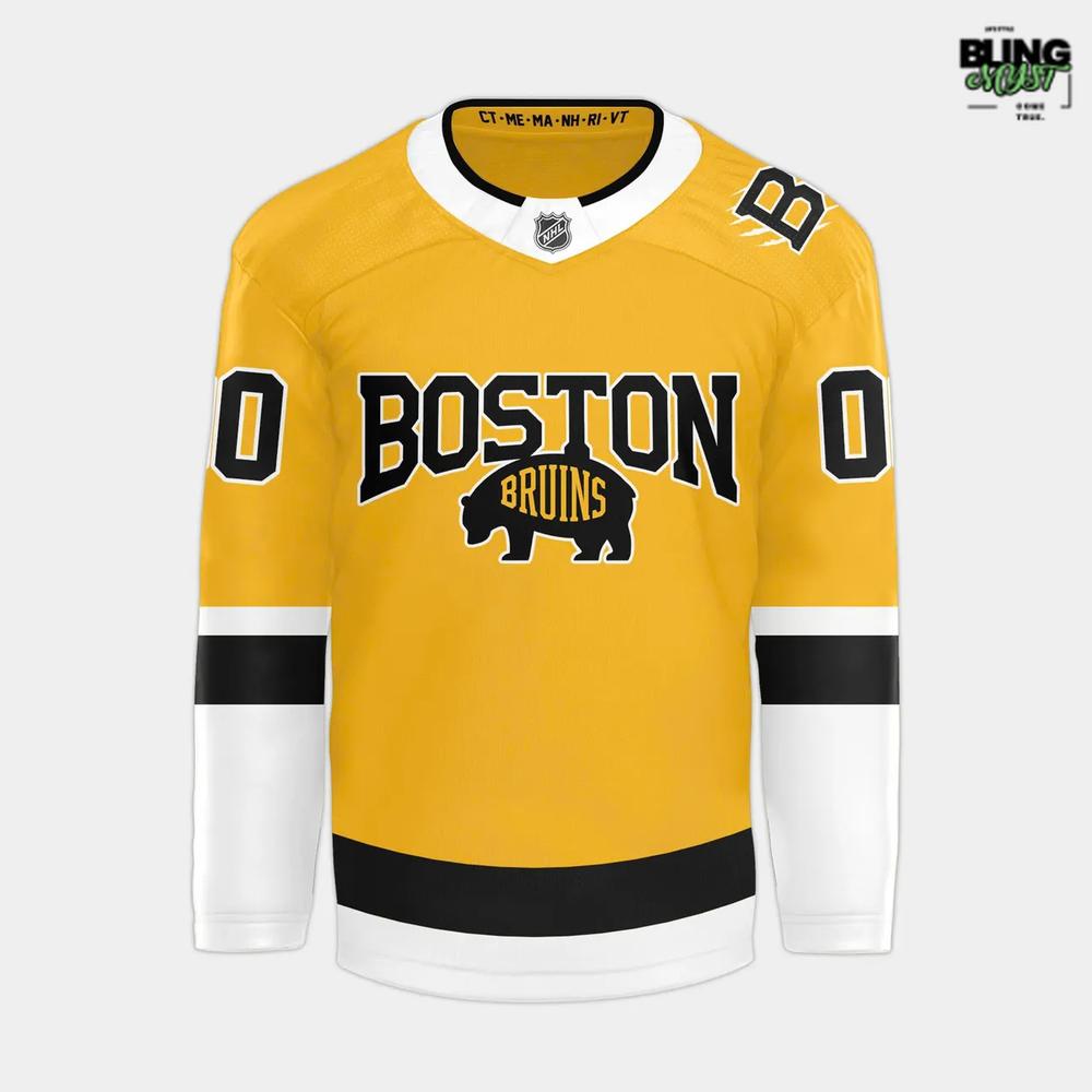 Vibrant gold base paired with black-and-white accents, clean striping, and bold Bruins graphics