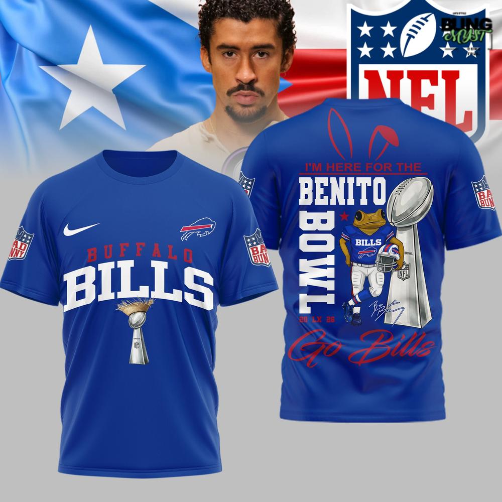 The Buffalo Bills NFL Benito Bowl 2026 Super Bowl T-Shirt is a bold piece of modern fanwear that understands one thing perfectly: big games aren’t just watchedβ€”they’re performed, shared, and remembered. On the front, the design is disciplined and classic, with strong BUFFALO BILLS typography in the team’s signature royal blue and red. The composition is clean and centered, while the small trophy graphic adds immediate Super Bowl significance without turning the shirt into visual clutter. It’s the kind of front you can wear anytimeβ€”simple, legible, and unmistakably Bills.