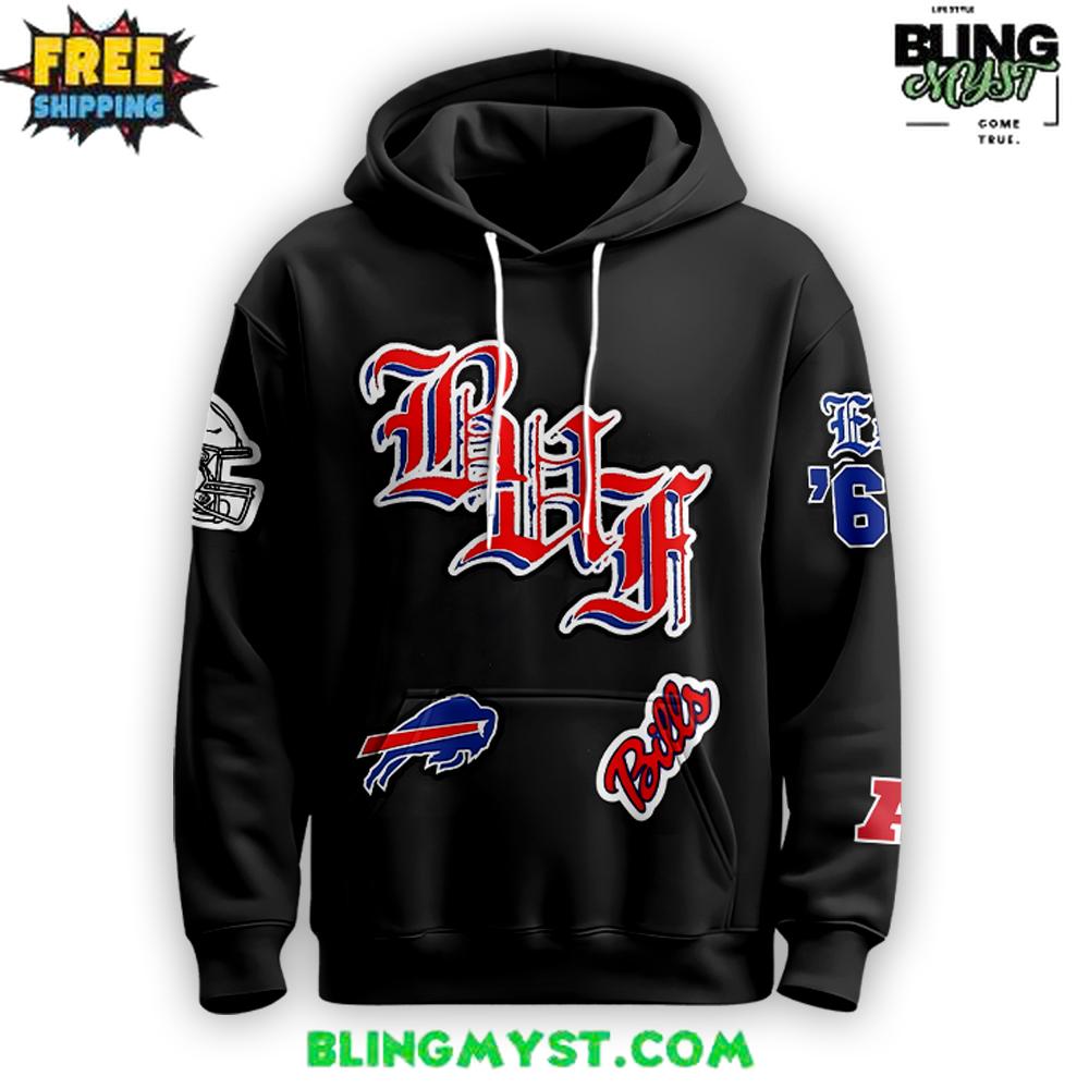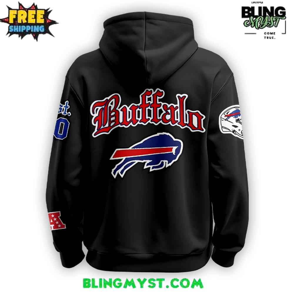 Striking black hoodie design with oversized Old English “BUF” lettering, Bills script, and logo hits that give it a custom, throwback-varsity feel.