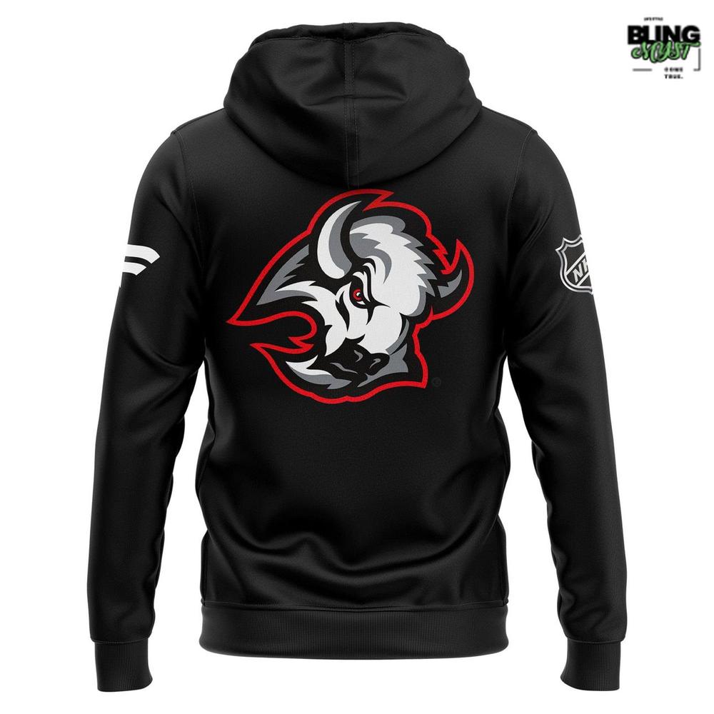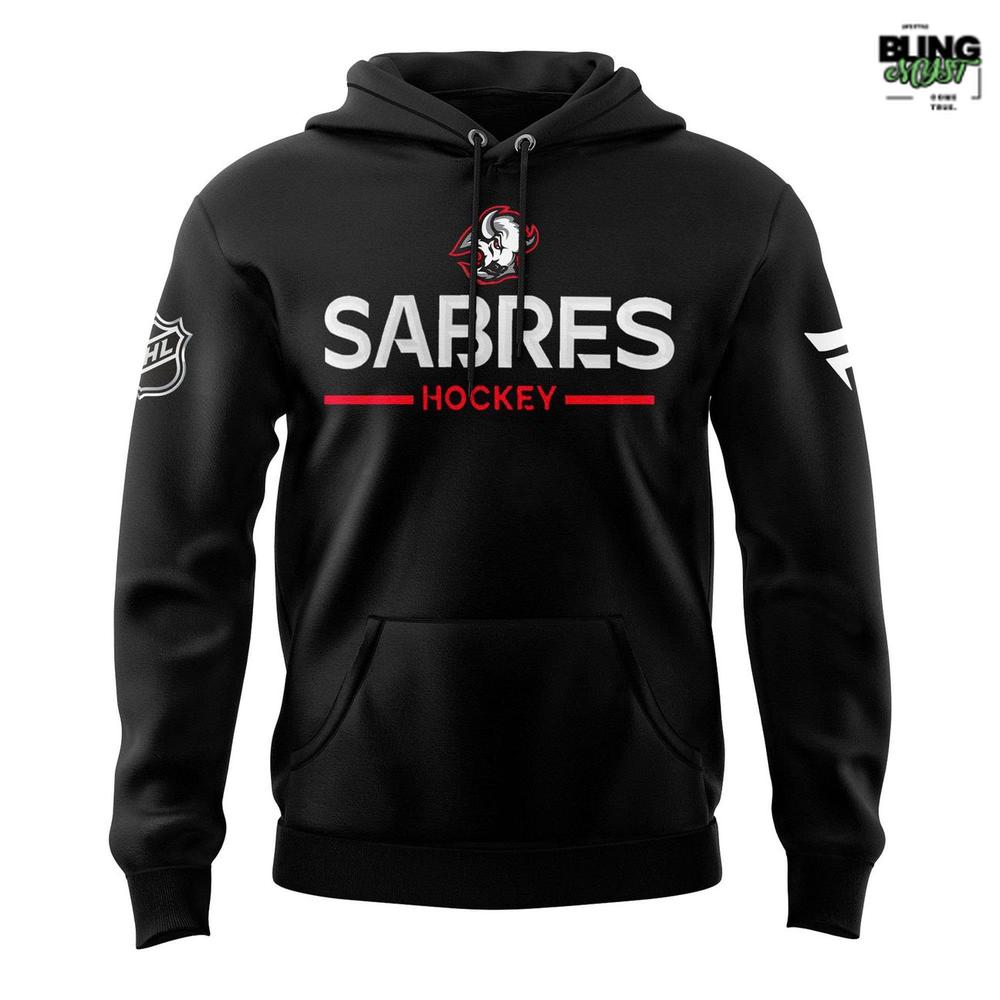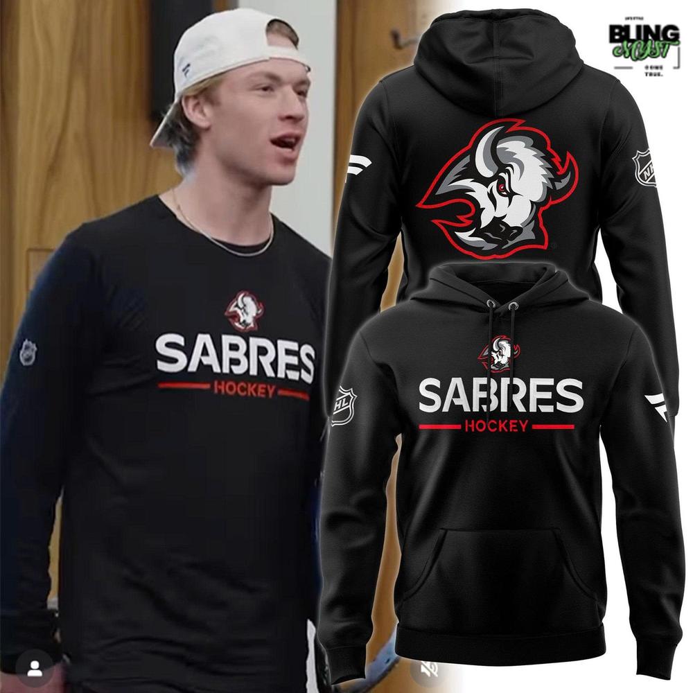 The Buffalo Sabres x Jack Quinn 2026 Limited Hoodie reads like a deliberate collision of arena energy and street-essential minimalism—and that tension is exactly what gives it presence. The all-black base is a smart stylistic anchor: it’s sleek, forgiving, and instantly wearable, but also functions as a clean canvas for the graphics to hit with maximum clarity. On the front, the SABRES wordmark sits with a grounded confidence, reinforced by the sharp red accent line and the compact HOCKEY tag beneath—an understated structure that feels purposeful rather than loud.