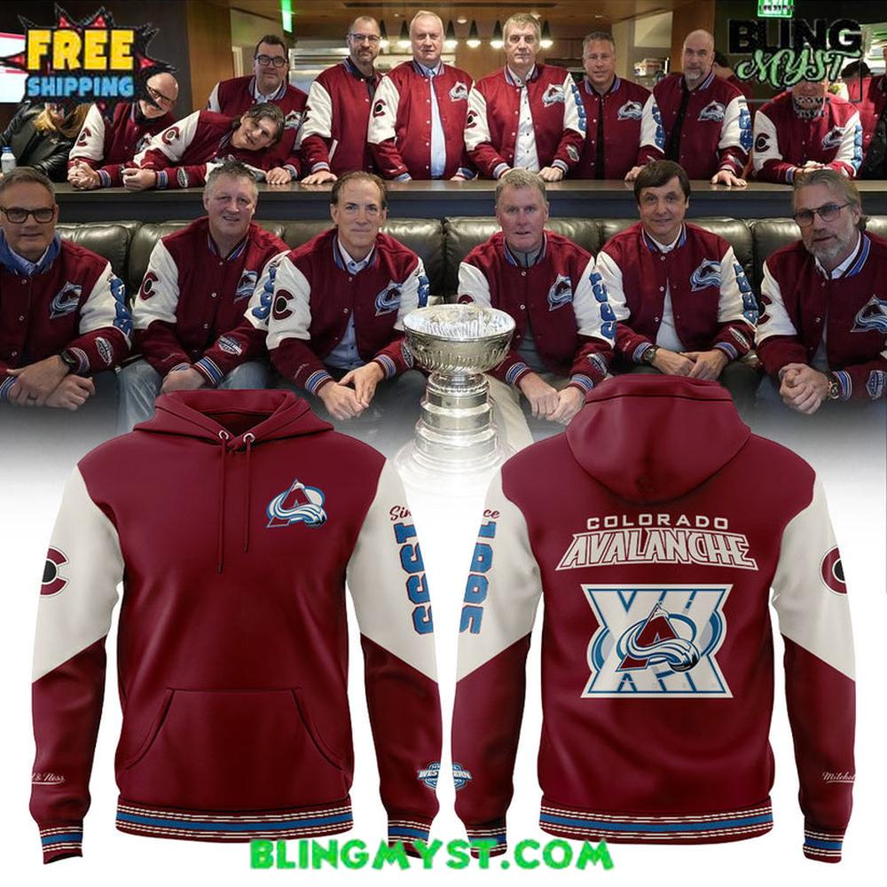 The Colorado Avalanche 30th Anniversary Limited Edition Hoodie reads like a wearable chapter of franchise history—less “fan hoodie,” more heritage artifact. Its design is anchored in the unmistakable burgundy-and-cream varsity palette, a choice that immediately evokes classic letterman tradition and championship-era nostalgia. That color blocking does heavy emotional work: burgundy carries the Avalanche’s identity with depth and seriousness, while the lighter sleeves bring an old-school collegiate energy that feels timeless rather than trendy.