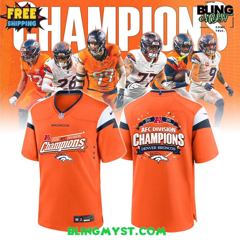 The Denver Broncos AFC Division Champions 2026 Fan Football Jersey is built as a bold celebration piece with unmistakable team energy. The dominant Broncos orange instantly commands attention and delivers that classic Mile High identity, while the contrasting navy and white graphic accents add structure and readability. The front design highlights β€œChampions” in a strong, banner-like layout, making the jersey feel official and event-driven rather than everyday fanwear. It reads clearly, confidently, and proudlyβ€”exactly what championship gear should do.