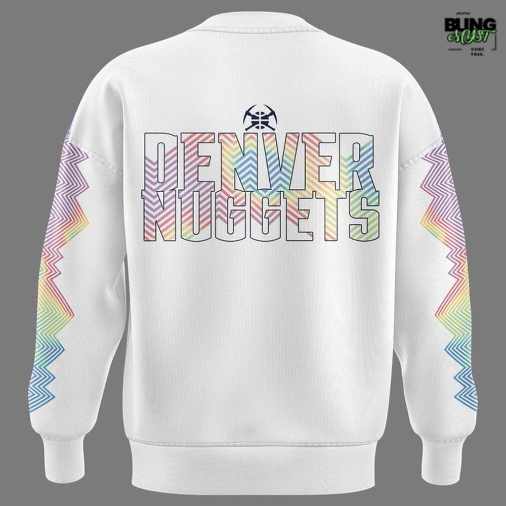 - Showcases a clean white base accented by dynamic rainbow zigzag patterns down the sleeves β a nod to the Nuggetsβ legendary skyline design.