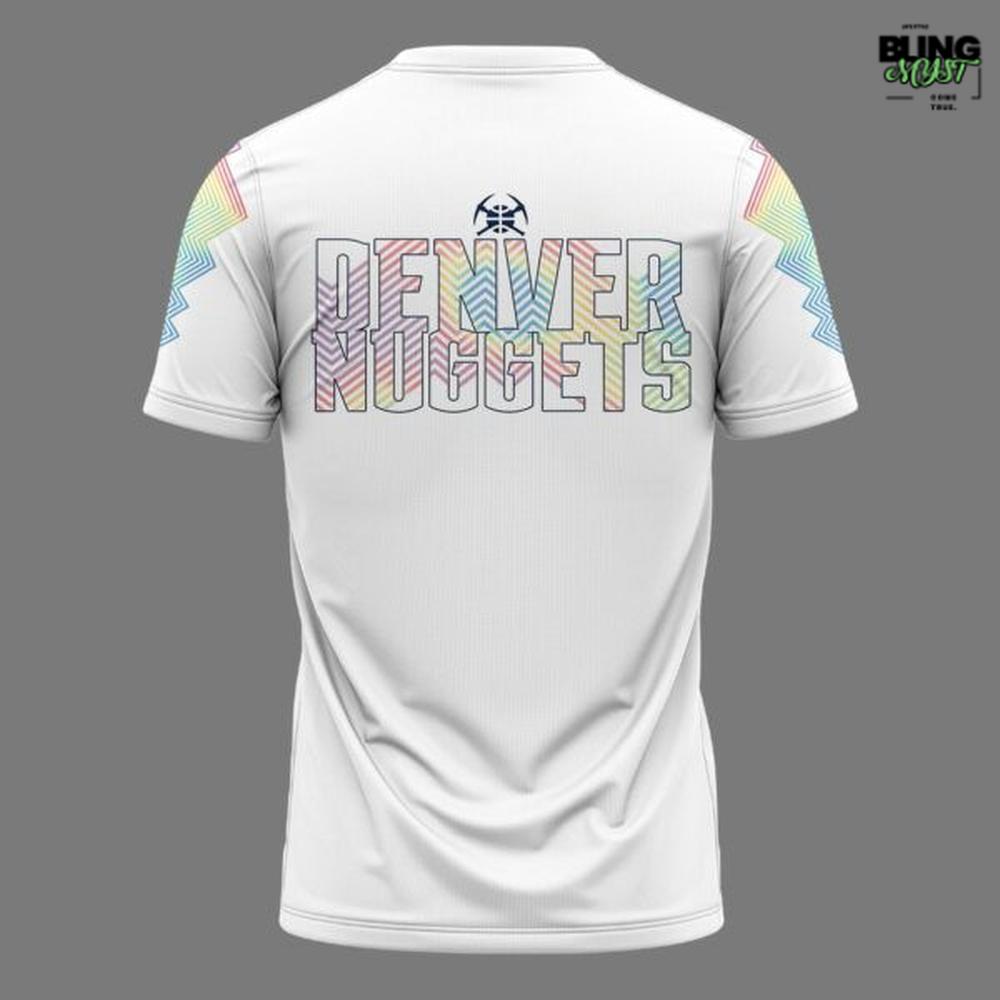 - Features a clean white base complemented by vibrant rainbow zigzag accents on the sleeves — a nod to the Nuggets’ classic skyline heritage.