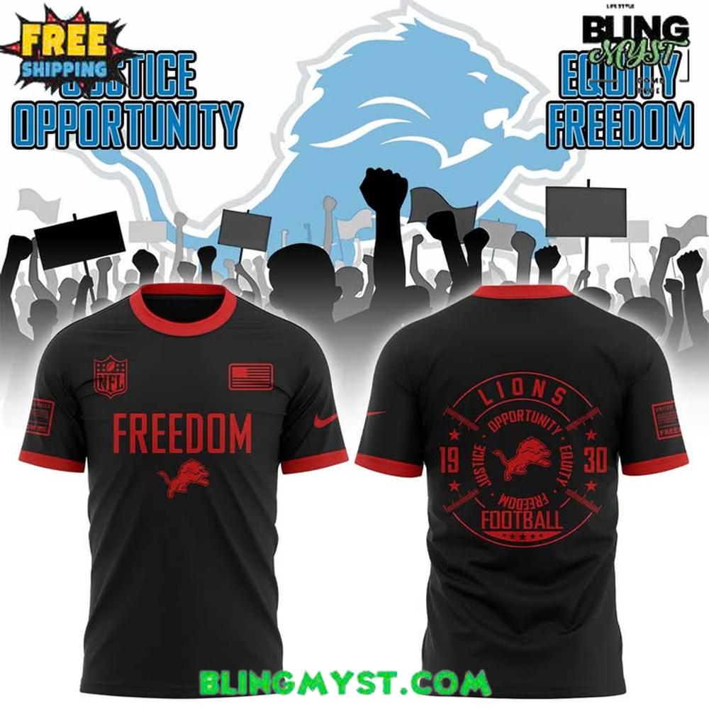 The Detroit Lions 2025 Justice Opportunity Equity Freedom T-Shirt brings powerful messaging and clean team-inspired style together in a bold modern fan tee.