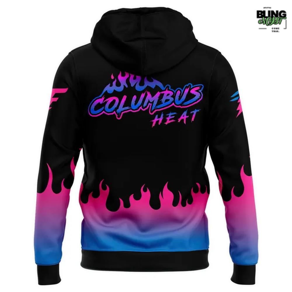 Grounded in a sleek, deep black canvas that makes the stylized “HEAT FARGO” chest typography and the striking “COLUMBUS HEAT” back lettering truly pop under the city lights.