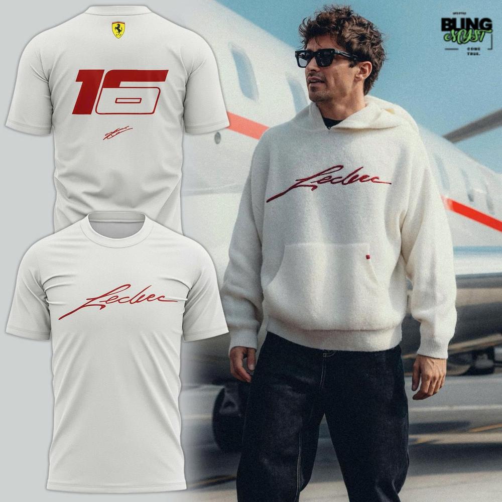 Crafted in a clean white base, it features Charles Leclerc’s signature in striking Ferrari red across the chest for a minimalist yet iconic look.