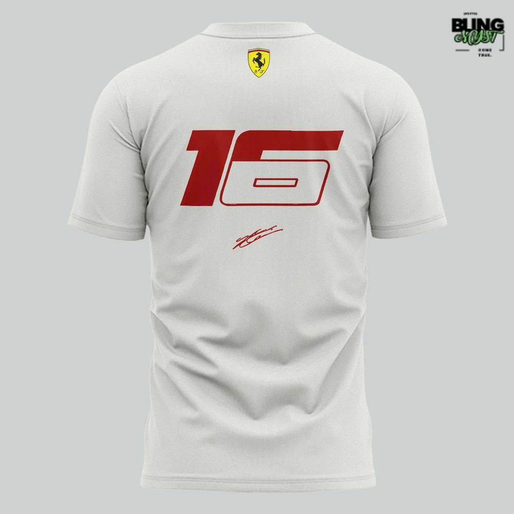 The back showcases Leclerc’s race number “16” in bold red lettering, accompanied by his autograph and a subtle Ferrari badge near the collar.