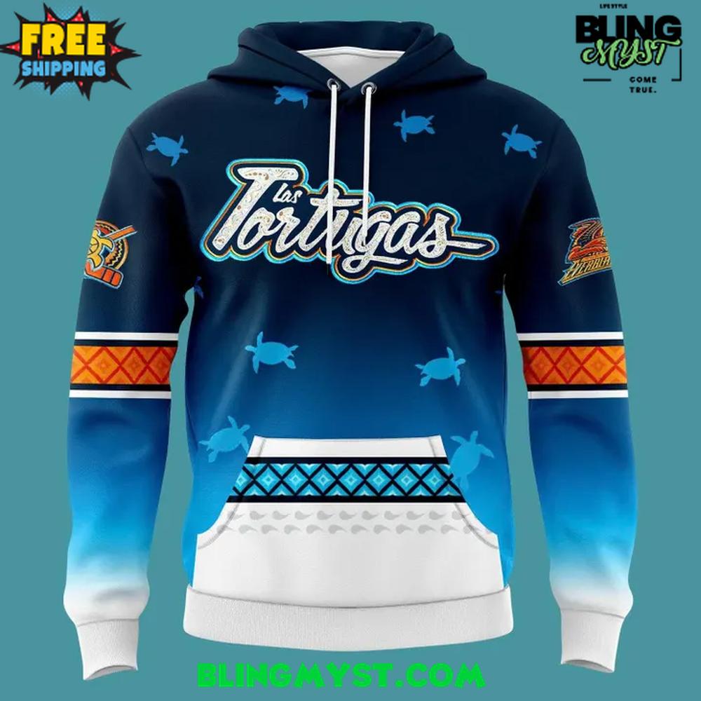From a design perspective, the hoodie excels in layered storytelling. The front “Tortugas” wordmark anchors the piece with Spanish-language visibility, placing culture at the center rather than the margins. Subtle star motifs add movement and festivity, while the geometric patterned banding across the midsection and sleeves introduces artisan-inspired texture that feels intentional and refined. On the back, the Everblades crest delivers bold team presence, creating a clear narrative: heritage forward, fandom grounded. The detailing feels curated, not crowded, which elevates the hoodie beyond novelty.
