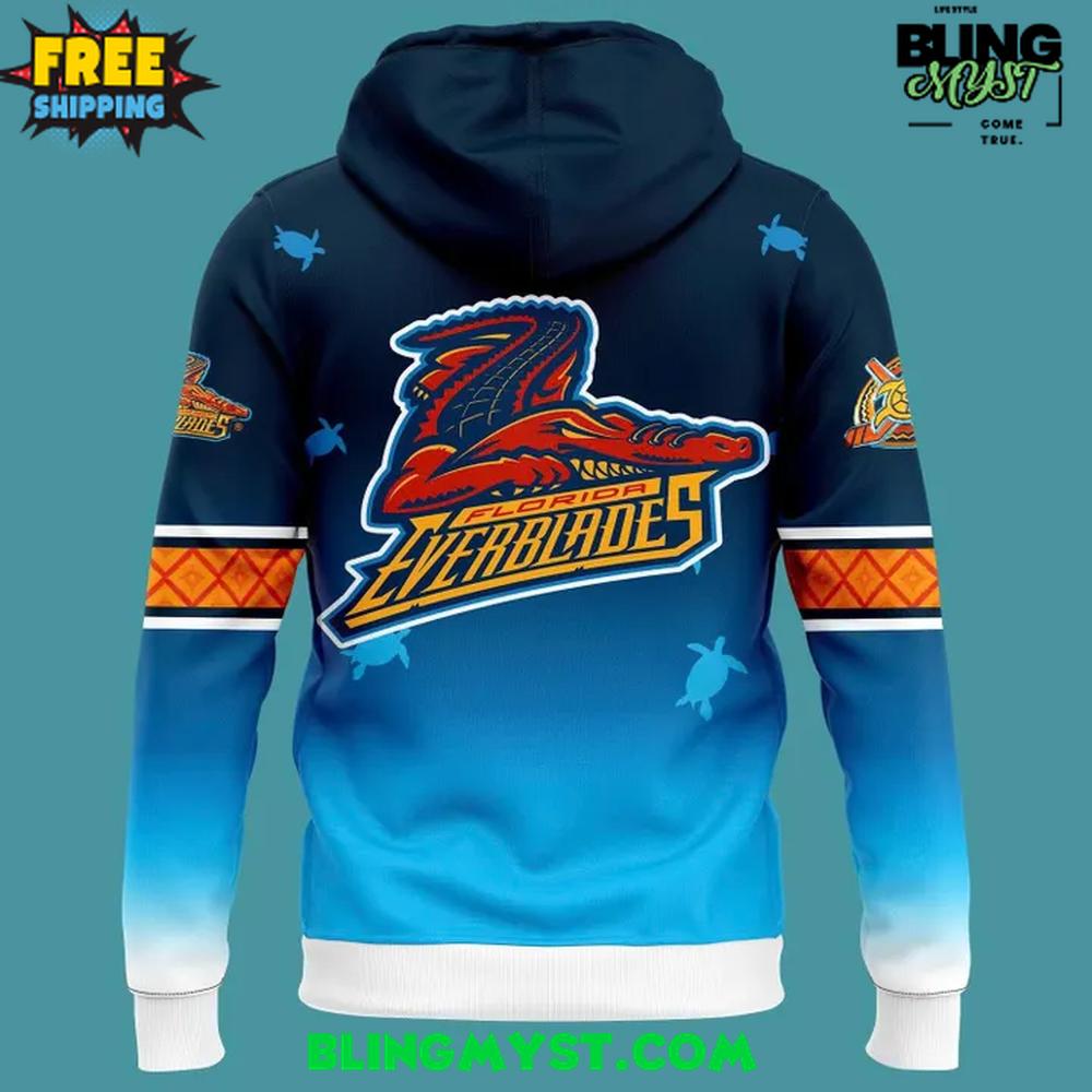 The Florida Everblades Hispanic Heritage Night 2026 Hoodie as celebratory streetwear that blends cultural pride with modern sports aesthetics. The standout feature is the teal-to-aqua gradient, which feels coastal, vibrant, and fluid, echoing Florida’s energy while softening the traditional toughness of hockey apparel. The hoodie silhouette remains classic and relaxed, ensuring everyday wearability, while the color story instantly signals a special-edition identity. It’s expressive without being overwhelming—an ideal balance for a heritage-focused piece.