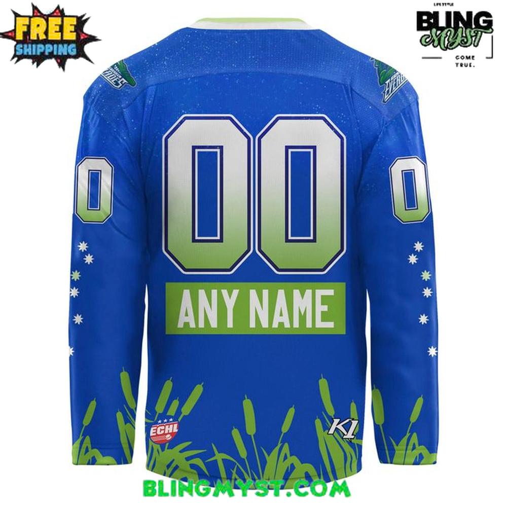 The first impression is pure electric blue, a color choice that reads bold on ice and even bolder in street settings. The front crestβ€”Everblades iconography with a stylized blade-and-creature motifβ€”anchors the jersey with clear team identity, while the surrounding graphic splashes and green accents bring in a sense of tropical motion. The bottom-edge patterning feels like reeds or shoreline growth, an organic detail that adds texture and storytelling without overwhelming the silhouette. It’s a smart contrast: structured numbers and clean striping up top, then a more expressive, nature-driven graphic language below.