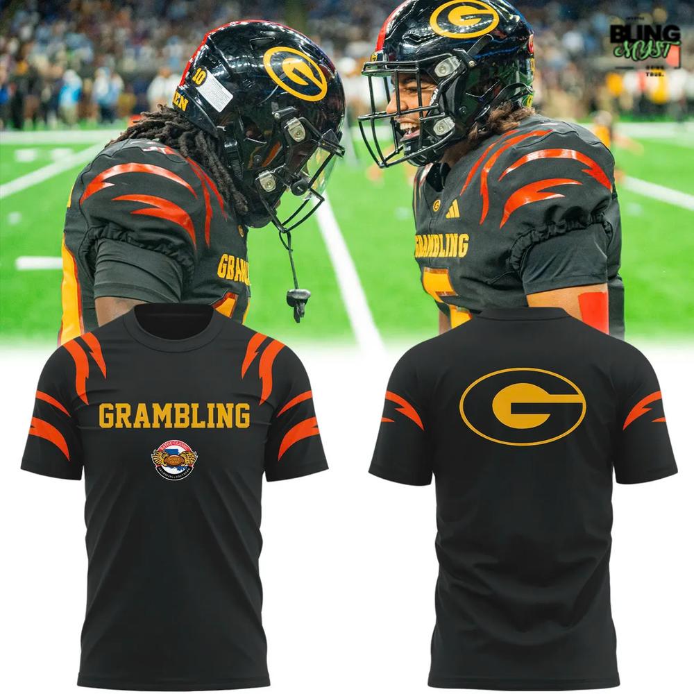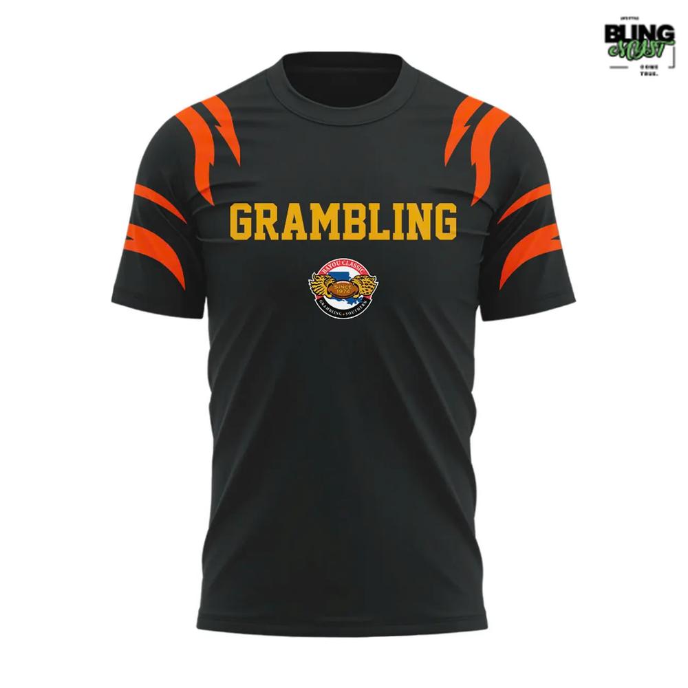 - Vibrant gold βGramblingβ lettering and the detailed Bayou Classic emblem stand out powerfully against the dark background, giving the shirt unmistakable HBCU football character.