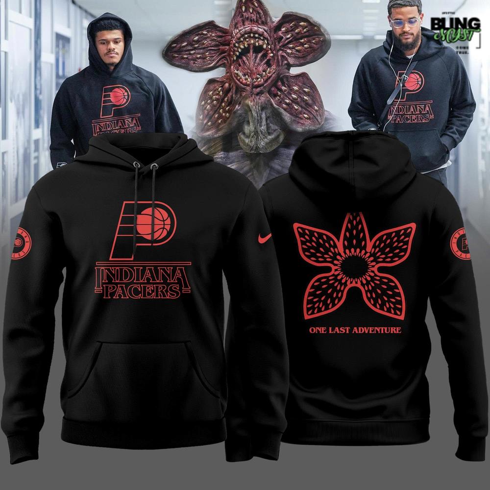 The Indiana Pacers x Stranger Things One Last Adventure Hoodie blends eerie Upside Down energy with bold team pride, creating a statement piece that looks straight out of a dramatic crossover episode.