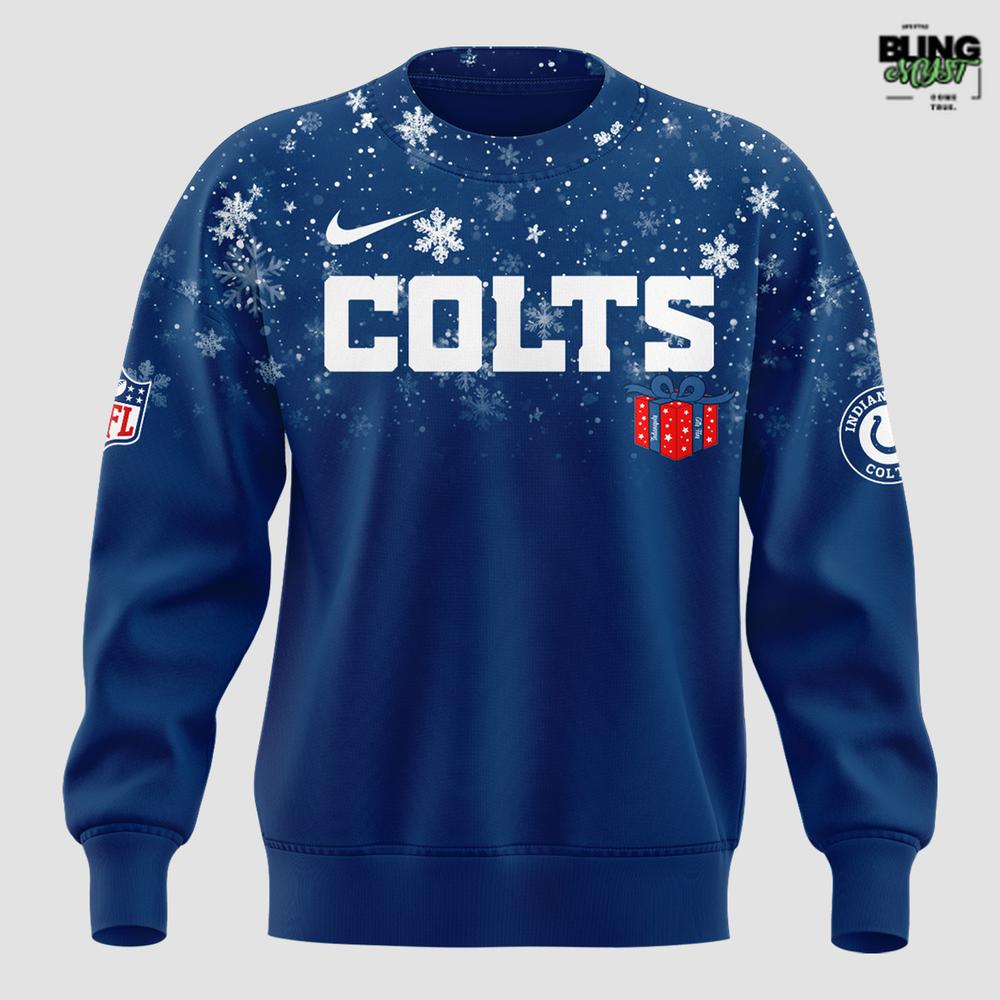 - This sweatshirt delivers a fun, festive look with bold Colts lettering and a snowy, winter-inspired graphic layout.