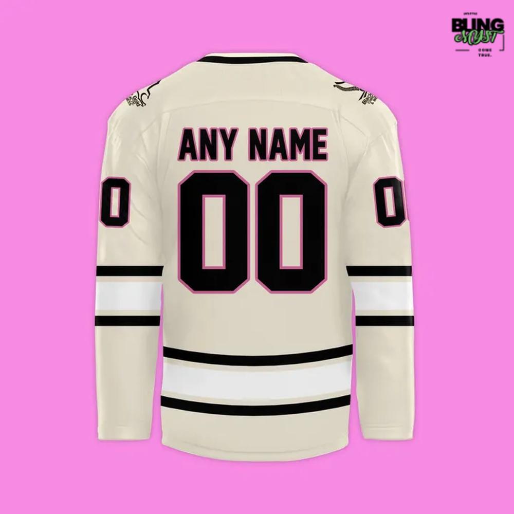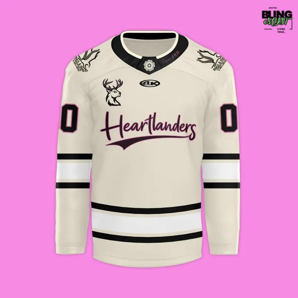 The Iowa Heartlanders EmpowerHer Night Hockey Jersey is a masterclass in how restraint can still feel loudβ€”not through noise, but through meaning. Instead of relying on heavy graphics, it builds its impact through a clean, confident palette: a warm cream base contrasted by black striping and bold, high-legibility numbers. The result feels elevatedβ€”less β€œtheme-night costume,” more intentional design object you could wear beyond the rink.