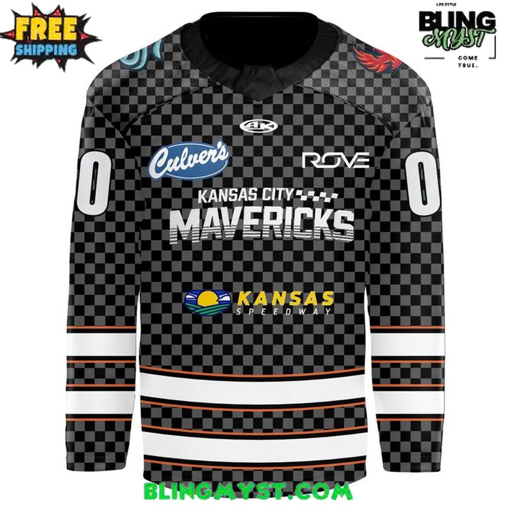 The Kansas City Mavericks 2026 Racing Hockey Jersey is a confident mash-up of rink tradition and motorsport attitude, designed to be seen at full speed. Instead of leaning on classic striping alone, it borrows the visual language of the trackβ€”checkered patterns, sponsor-style marks, and bold number workβ€”then translates it into a jersey that feels more like a race-day livery than standard teamwear. The result is loud in concept but surprisingly structured in execution.