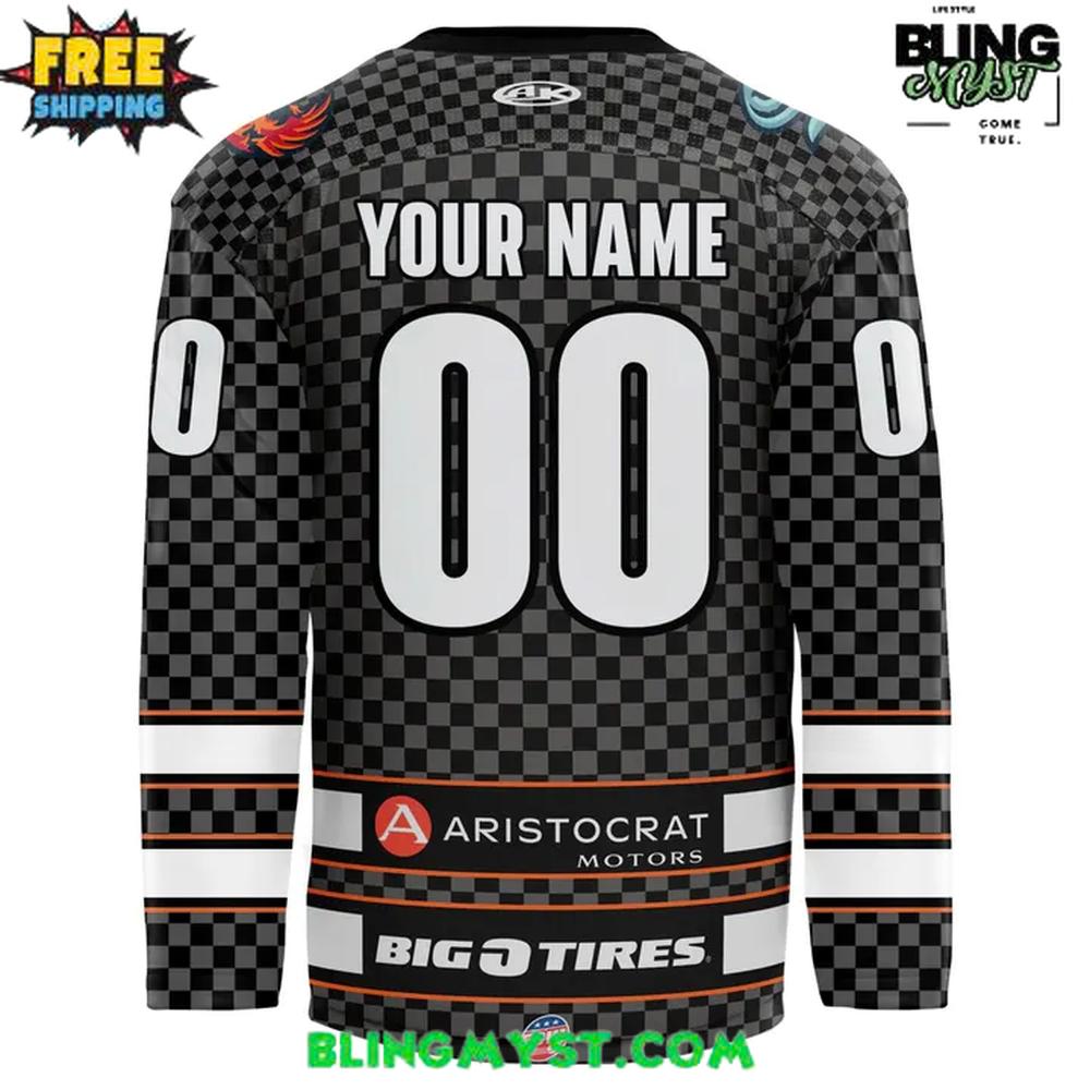 The Kansas City Mavericks 2026 Racing Hockey Jersey as a bold fusion of hockey culture and motorsport aesthetics. The fit reads like a classic hockey silhouetteβ€”roomy through the body and sleevesβ€”built for layering over a hoodie or long-sleeve. What elevates it is the full-coverage checkered pattern, instantly associated with racing and speed. The black-and-grey palette keeps it wearable while still feeling high-energy, making the jersey look aggressive, modern, and ready for the spotlight.