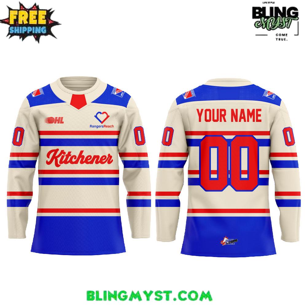 The Kitchener Rangers Warmups “R-Town” Hockey Jersey delivers a strong heritage-first hockey aesthetic with a warm, community-driven edge. The cream/white base instantly sets a vintage tone, while the bold royal blue and red striping brings classic Rangers energy to life. The scripted “Kitchener” wordmark across the chest feels personal and nostalgic, reinforcing a sense of local pride rather than corporate branding. Overall, the design reads like a true warmup sweater—authentic, structured, and rooted in hockey tradition.