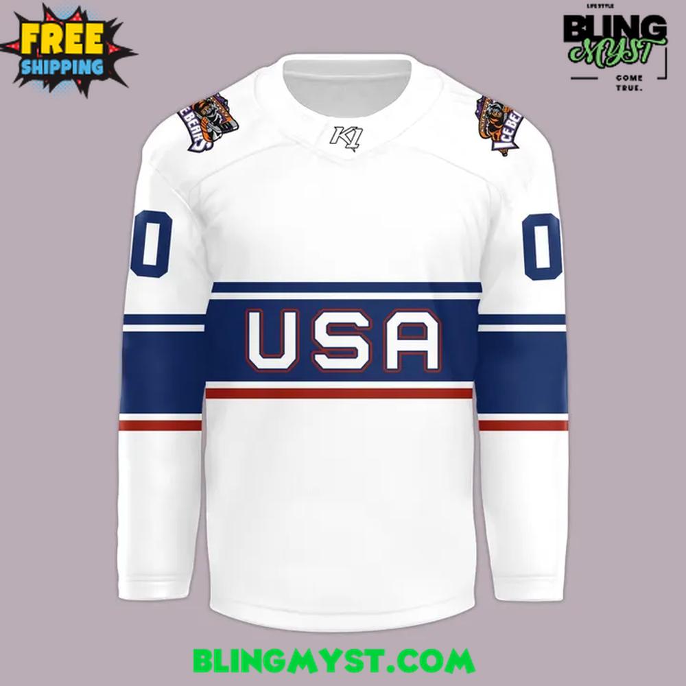 The Knoxville Ice Bears “Go for Gold Night” 2026 Hockey Jersey succeeds by leaning into a national-team visual vocabulary while still feeling like a true arena collectible. The dominant ice-white base is immediately striking—clean, ceremonial, and deliberately “medal-night” in tone—giving the jersey a sense of occasion rather than everyday kit. It also functions as a perfect canvas for the graphic elements to read sharply from a distance, which is essential for anything designed to be worn in a loud, fast-moving rink environment.