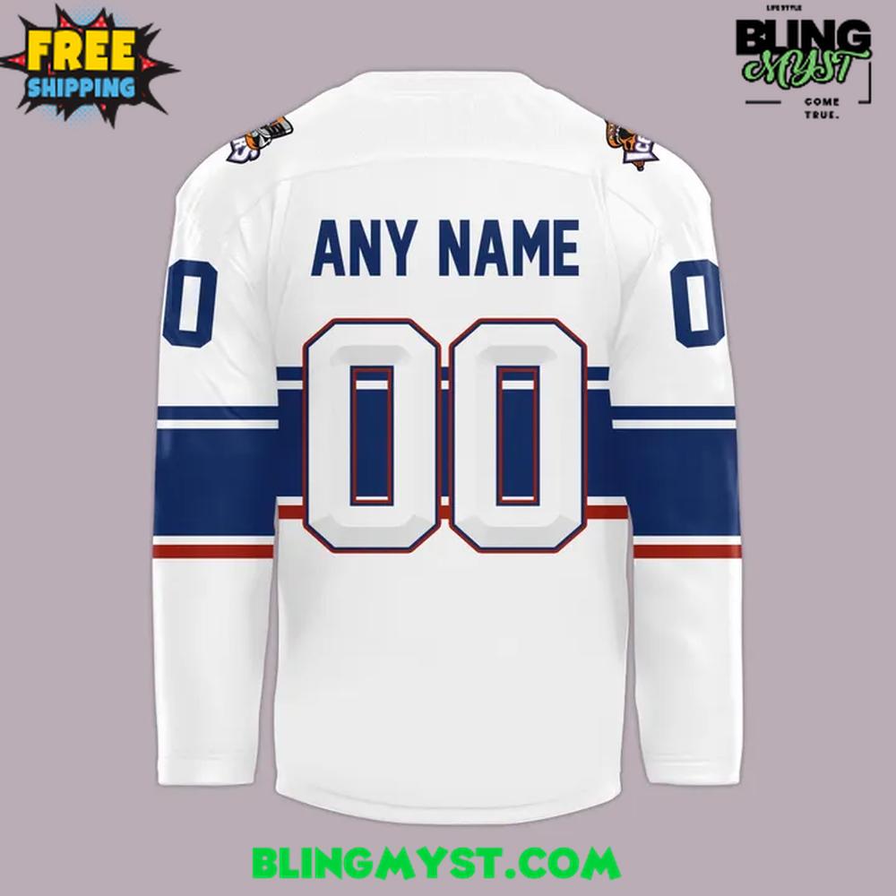 The Knoxville Ice Bears β€œGo for Gold Night 2026” Hockey Jersey aims for a ceremonial, spotlight-ready identityβ€”and largely succeeds by leaning into clean nationalism-inspired minimalism rather than cluttered novelty. The dominant crisp white base reads as premium and intentional, giving the jersey an almost heritage feel, while the bold horizontal banding in deep navy and assertive red anchors the torso with classic rink authority. The front β€œUSA” block lettering is unapologetically directβ€”less β€œfashion jersey,” more statement pieceβ€”which fits a theme night meant to feel commemorative.