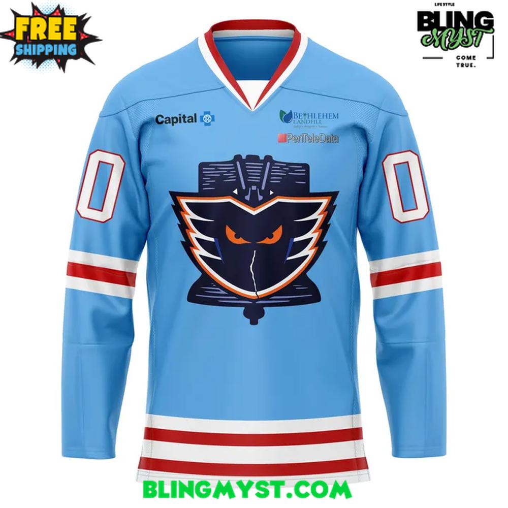 The Lehigh Valley Phantoms PA 250 Warm-Up Hockey Jersey succeeds because it treats a commemorative theme as design language, not decoration. The first impression is the unexpected powder-blue baseβfresh, optimistic, and instantly differentiating from the Phantomsβ usual darker identity. That choice feels intentional: it evokes heritage athletic uniforms and civic pride at the same time, giving the jersey a celebratory tone without drifting into novelty.