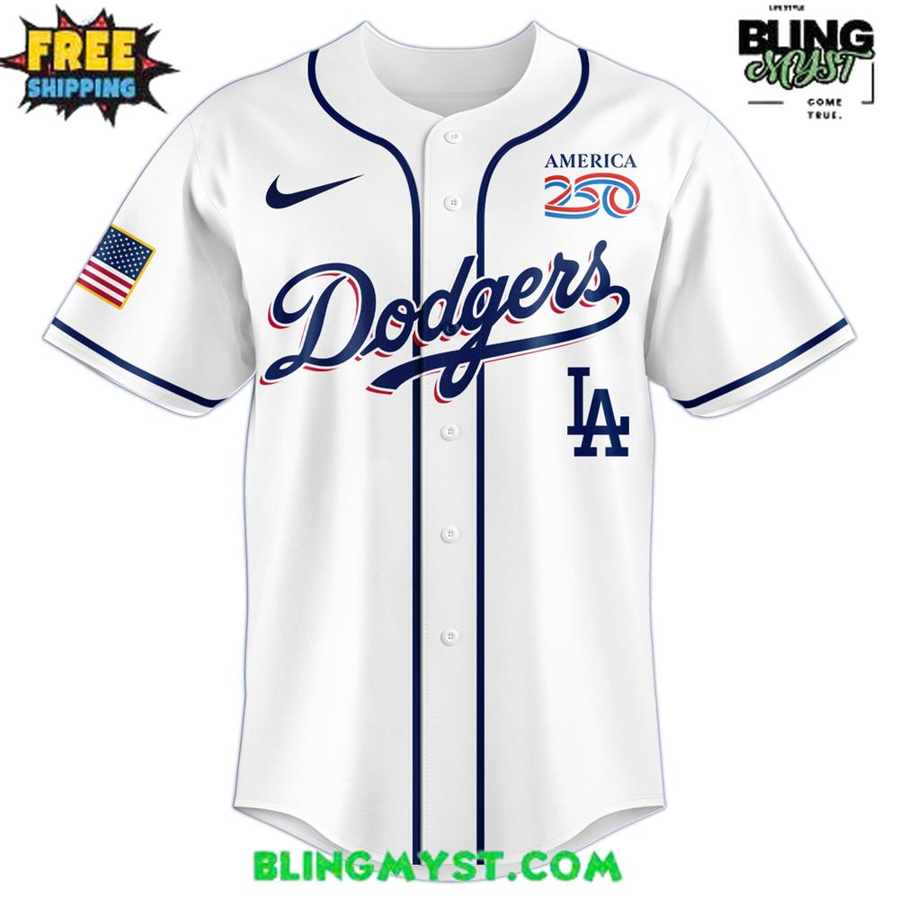 The Los Angeles Dodgers 250th USA of America Baseball Jersey is a confident blend of iconic team heritage and commemorative Americana, designed to feel both timeless and event-specific. The foundation is a crisp white base—pure, classic, and instantly “baseball”—while the clean navy piping down the button placket and sleeves adds structure and a tailored, uniform-grade finish. This disciplined framework gives the jersey a premium posture before the graphics even speak.