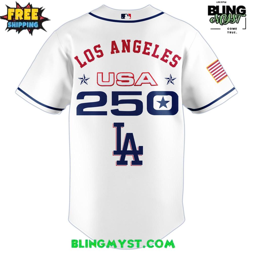 The back design turns up the statement factor with deliberate clarity. “LOS ANGELES” arches across the shoulders, “USA” sits centered with star accents, and the oversized “250” anchors the layout like a poster—built for distance, photos, and crowd visibility. The LA logo beneath seals the composition with a strong emblematic finish. Overall, this jersey succeeds as a collectible statement piece: controlled color, classic construction, and a narrative of pride, occasion, and baseball tradition—exactly what a commemorative edition should deliver.