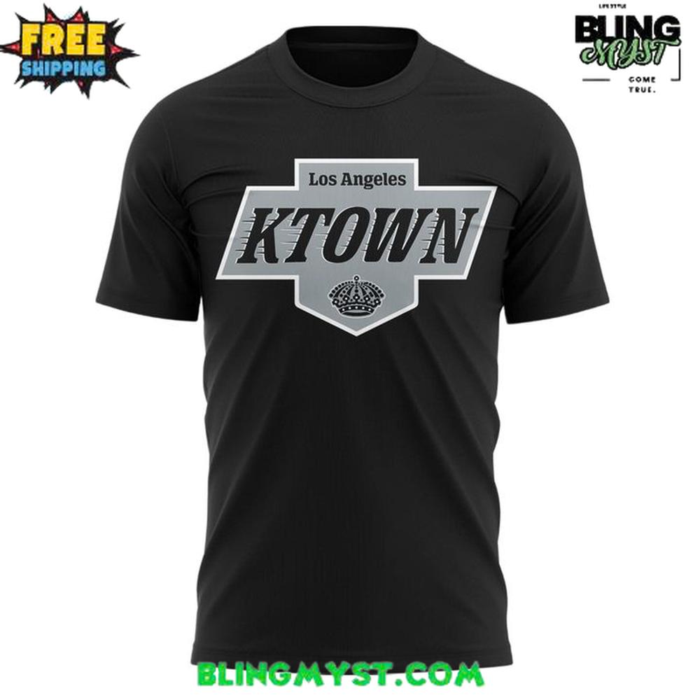 The Los Angeles Kings K-Town Night 2026 T-Shirt proves that the strongest merch doesn’t always need loud graphics—it needs clarity, culture, and a logo that carries weight. Built on an all-black base, the shirt taps into the Kings’ iconic monochrome DNA while aligning perfectly with LA’s streetwear sensibility. The centerpiece is the bold K-TOWN badge, rendered in high-contrast white with clean geometry that feels more like a city emblem than a temporary event print. It’s direct, instantly readable, and designed to look good in real life—on the street, in the arena, and in photos.