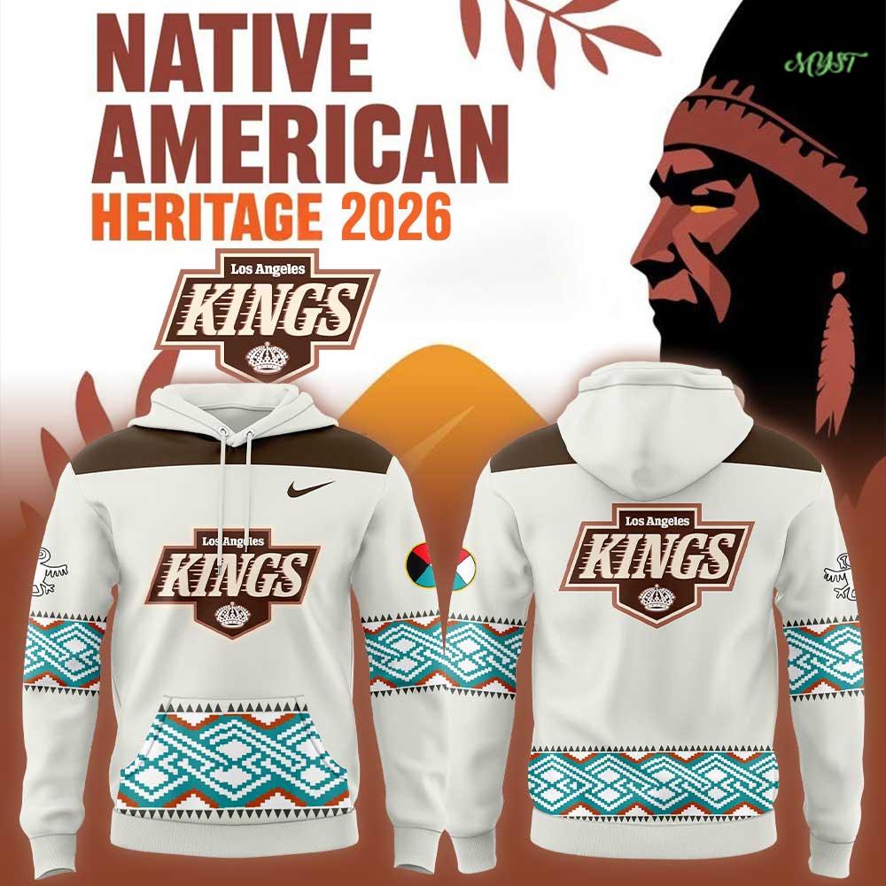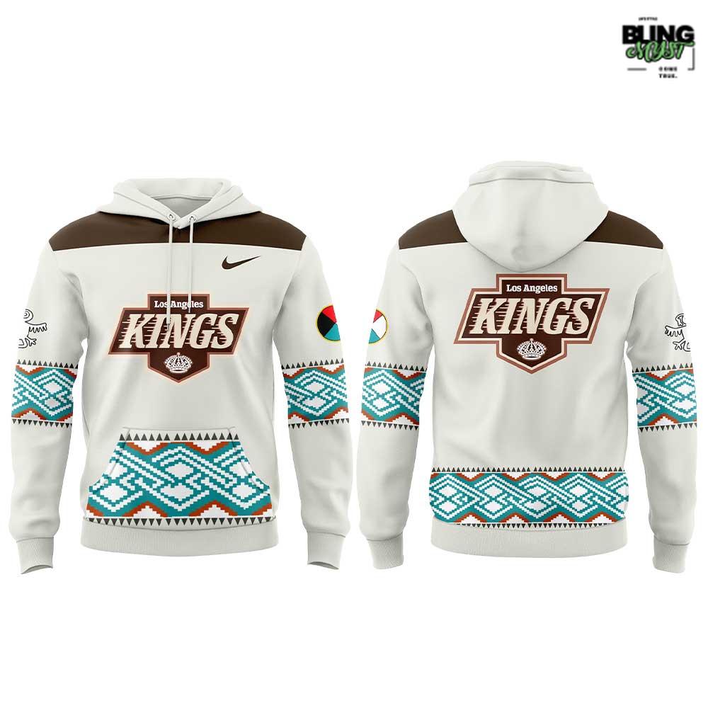 The Los Angeles Kings Native American Heritage Night 2026 Hoodie is presented as commemorative streetwear—a garment meant to honor community while still reading unmistakably as Kings fandom. The design begins with a refined cream/ivory base, a calm and premium choice that steps away from the Kings’ usual hard-edged black-and-silver identity. That softness matters: it creates a more ceremonial tone, giving the piece room to communicate recognition rather than pure competition.
