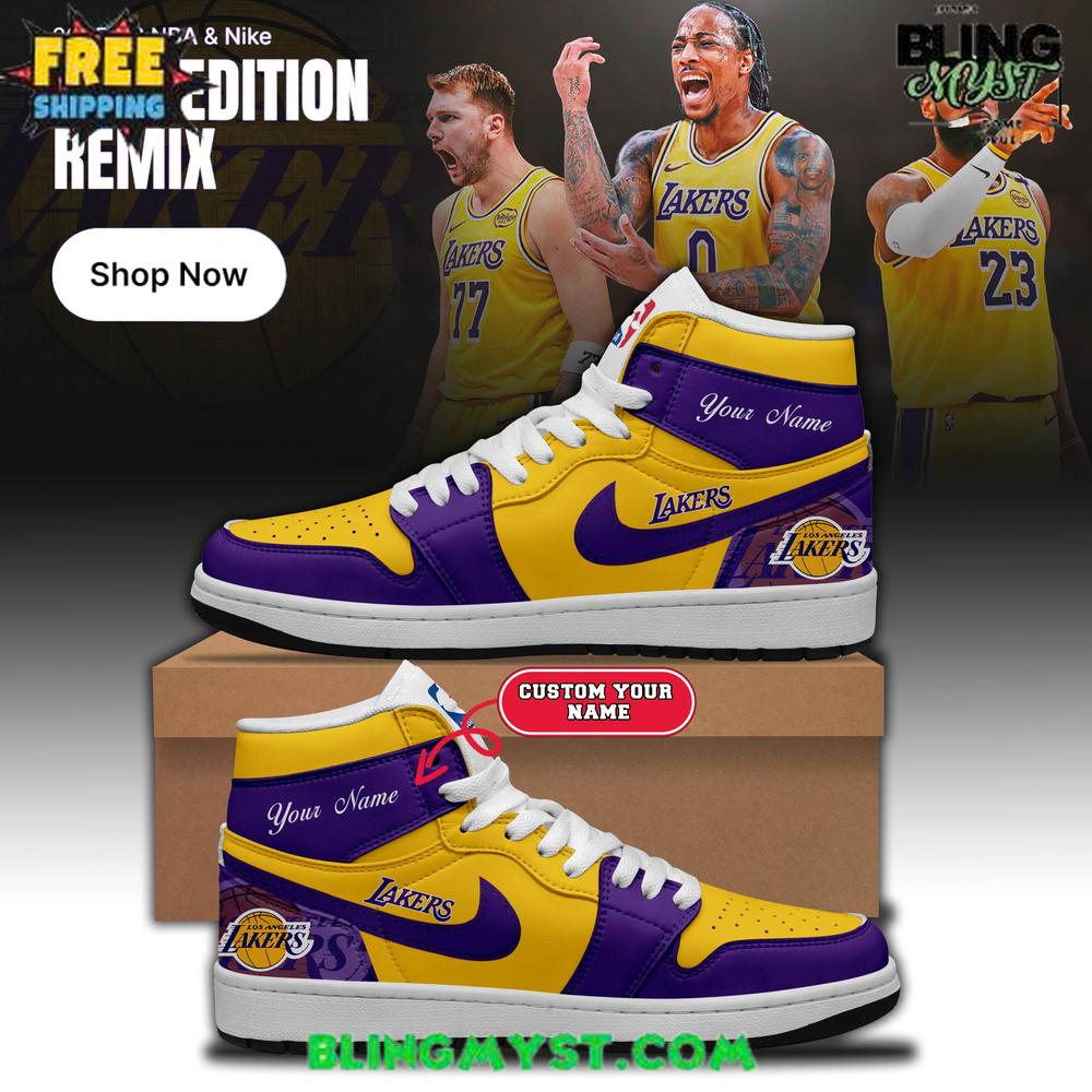 Lakers branding across the heel, mid-panel, and collar adds strong identity and team-focused attitude.