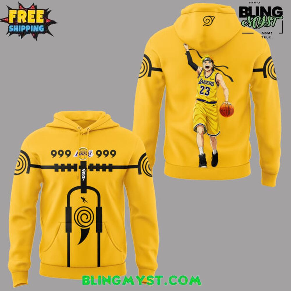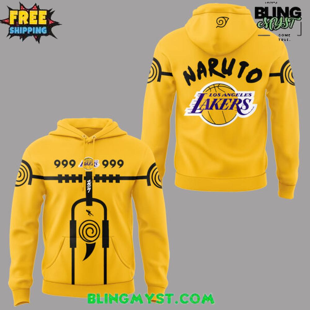 The Los Angeles Lakers x Naruto Shippuden Special Edition Hoodie is pure crossover spectacle—a piece that doesn’t just combine two fandoms, but fuses their shared obsession with legend, grit, and victory. The hoodie’s base is unmistakably Lakers: a saturated gold/yellow that reads like arena lights and championship banners. It’s a bold foundation, but the design pushes beyond sports colorways into something closer to anime poster art, turning the garment into a wearable graphic statement.