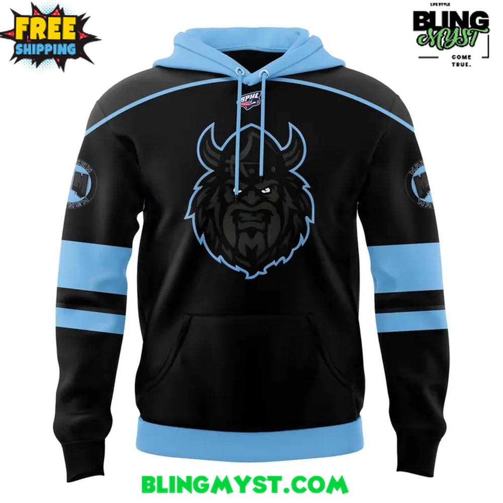 The Macon Mayhem Blackout 2026 Hoodie is a clean demonstration of how a “blackout” concept can feel premium rather than predictable. The foundation is unapologetically dark and streamlined—a deep black body that signals stealth, toughness, and modern edge. But what gives it true identity is the controlled use of ice-blue accents, especially in the sleeve striping and hood contrast, which creates a sharp, high-visibility rhythm without breaking the blackout mood. It’s a design that feels built for night games, cold arenas, and streetwear rotation alike.