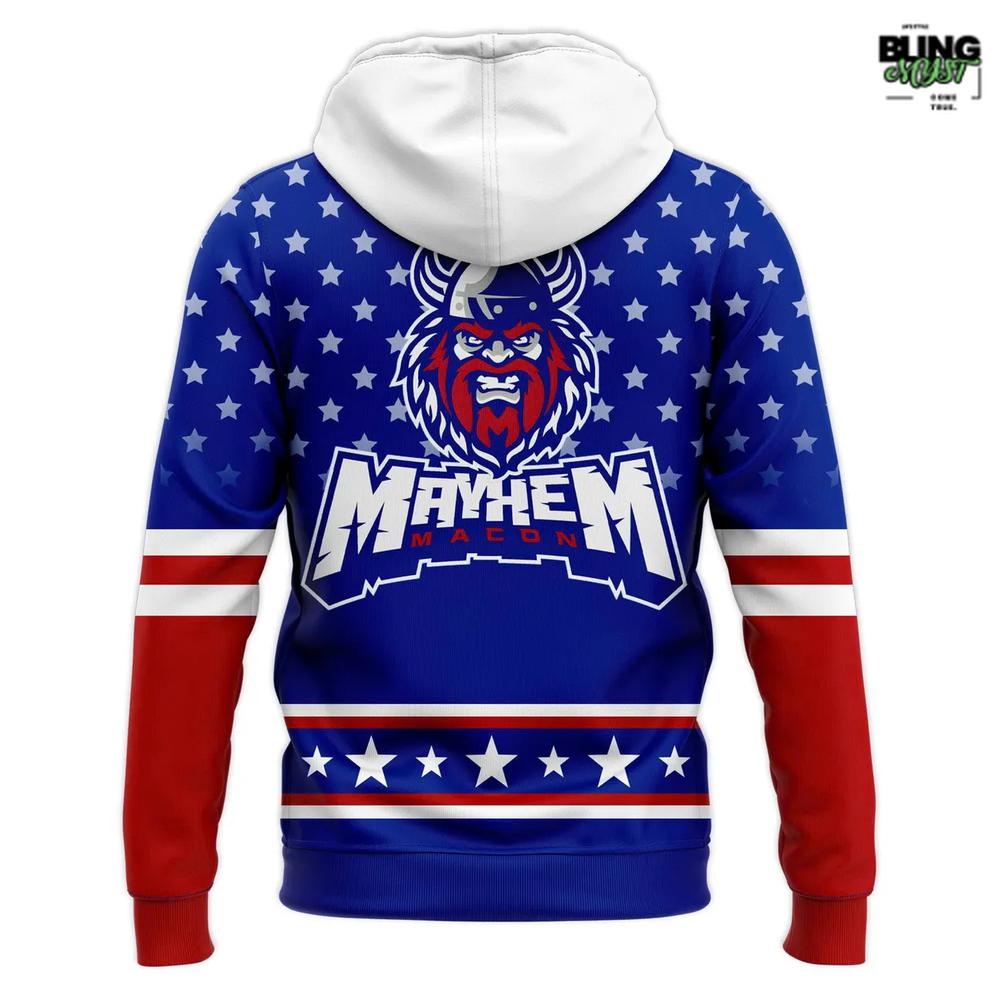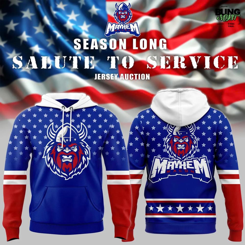 The Macon Mayhem Salute To Service Special Edition Hoodie brings bold patriotic energy together with unmistakable team pride in a design that commands attention from every angle.