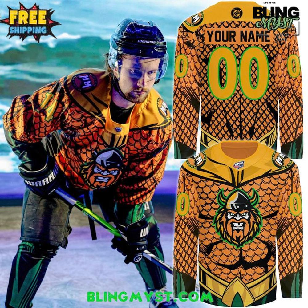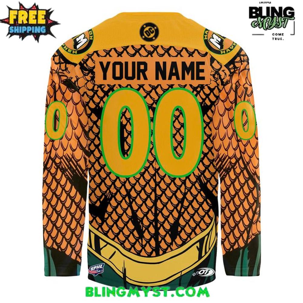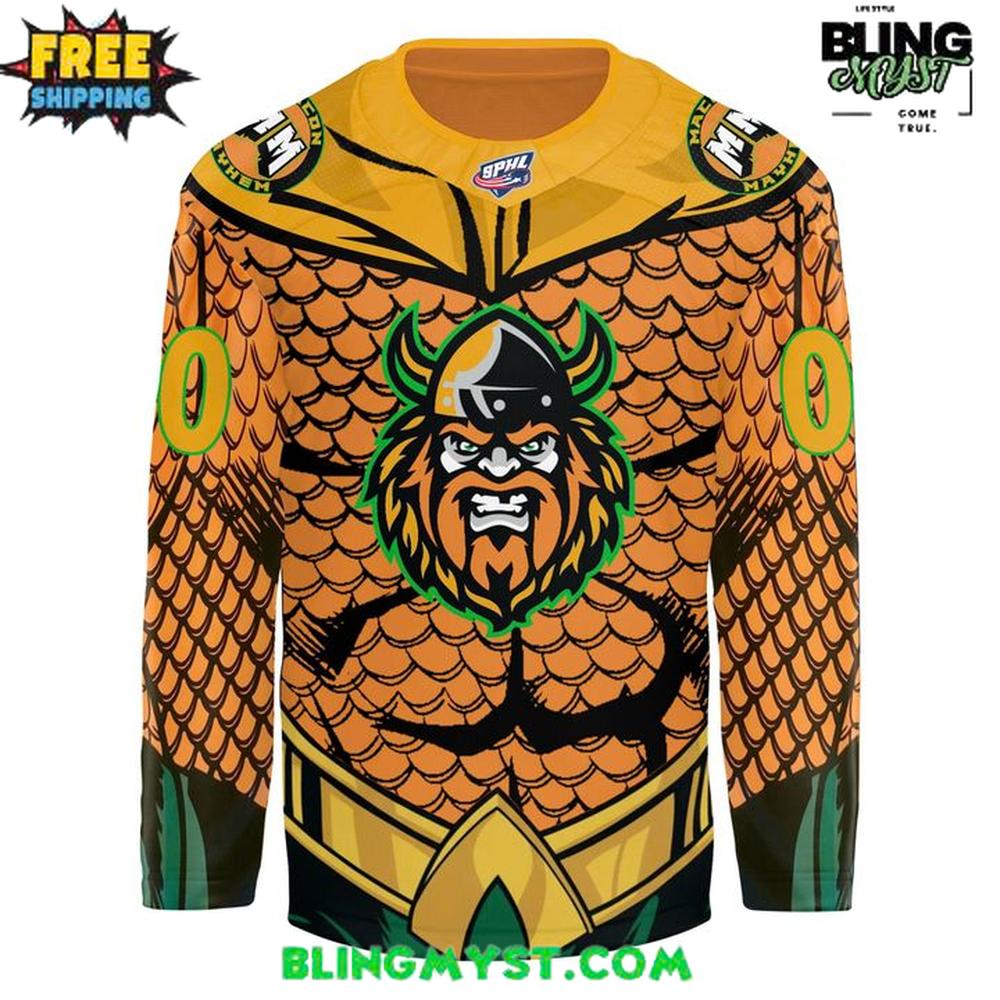 Unleash the power of the seven seas on the ice with the Macon Mayhem Super Hero Night 2026 Hockey Jersey. This spectacular specialty jersey transforms the team’s look into legendary battle armor, featuring a vibrant scale-mail design inspired by the King of Atlantis. With the fierce Macon Mayhem Viking mascot commanding the chest, this jersey is a bold fusion of comic book lore and hard-hitting hockey grit.