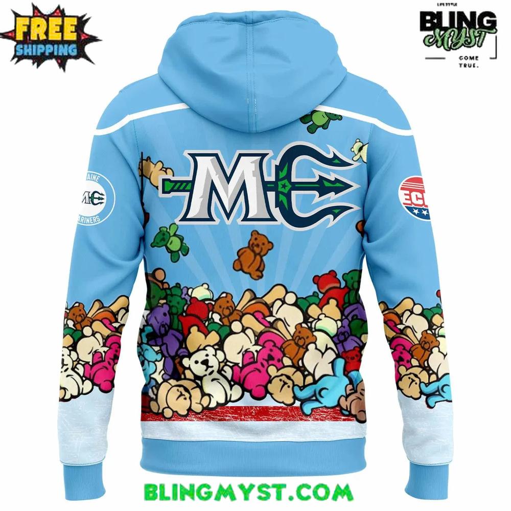 The Maine Mariners Our Teddy Bear Toss 2025 Hoodie captures the joy and energy of a beloved hockey tradition with its vibrant sky-blue backdrop and colorful all-over teddy bear graphic.