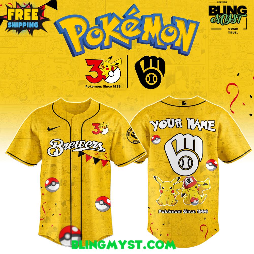 The striking electric yellow base is heavily detailed with dynamic confetti patterns and classic Pokéballs, beautifully highlighting the Brewers script on the chest and an exclusive Pikachu 30 commemorative graphic.