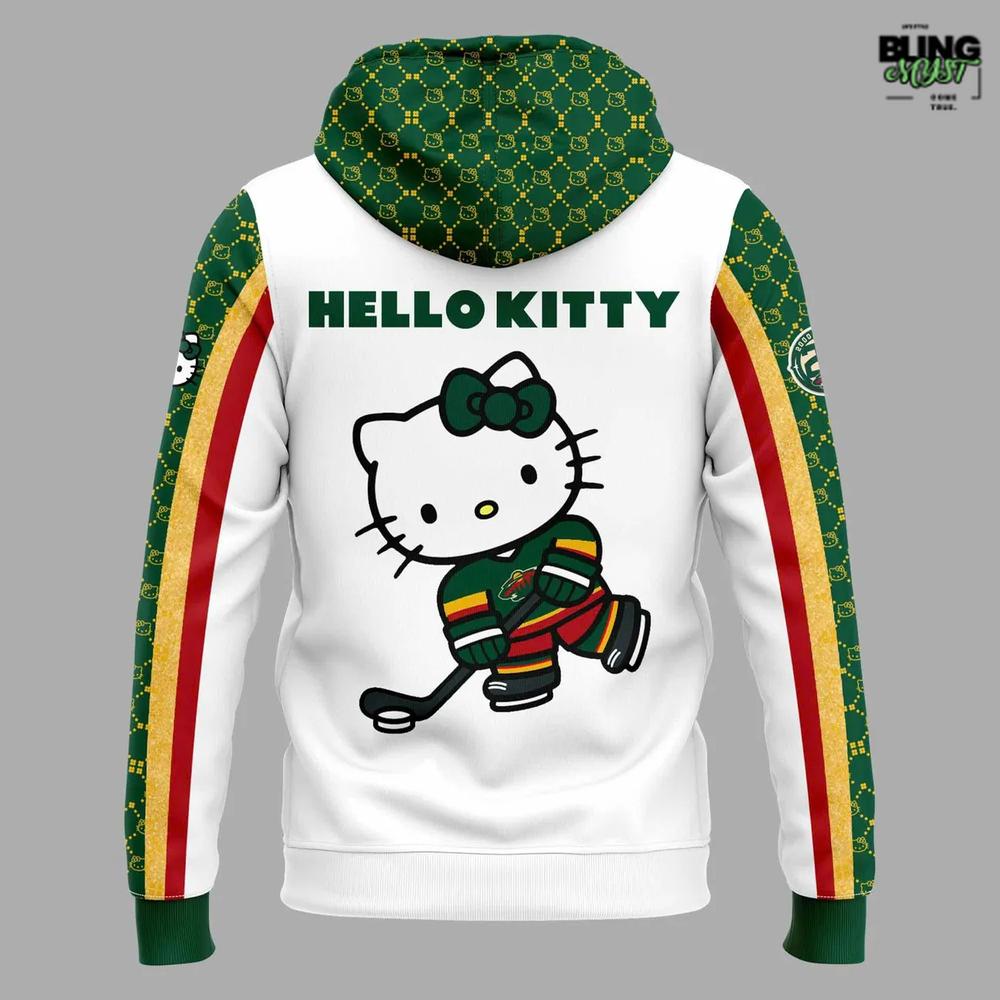 Designed in a white base with classic Minnesota Wild green, red, and gold striping, complemented by patterned sleeves and hood showcasing adorable Hello Kitty graphics.
