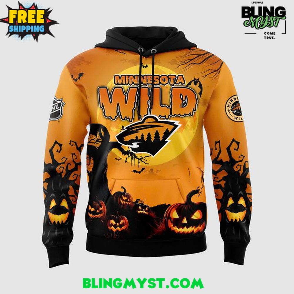 Celebrate the season in style with the Minnesota Wild Happy Halloween 2025 Hoodie, a perfect fusion of haunting visuals and hockey pride.