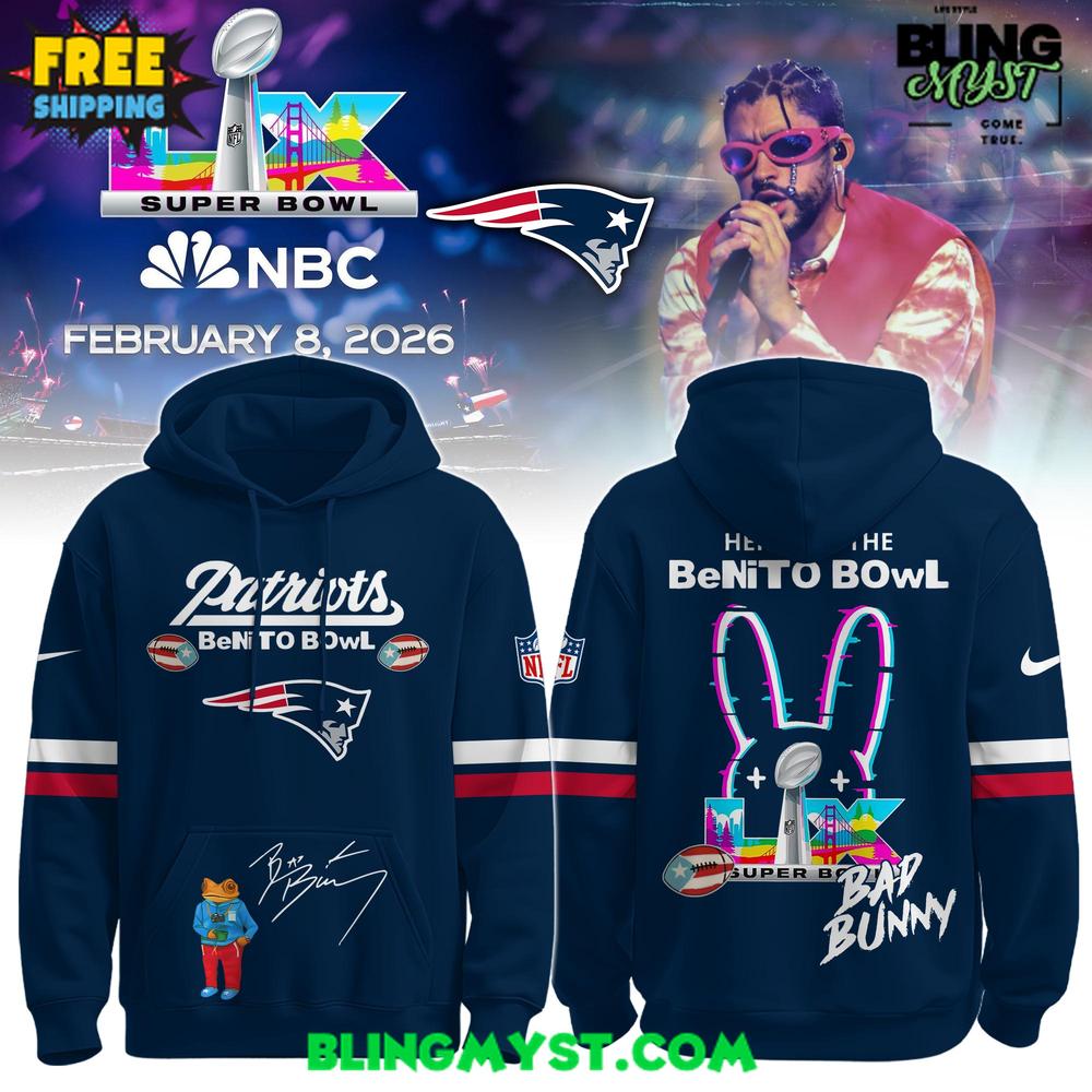 The front focuses on team recognition, with the Patriots wordmark taking lead and the Super Bowl framing elements reinforcing the sense of occasion. It’s a layout that feels like a commemorative patchwork—designed to be read quickly, the way fans scan banners and programs. The sleeve striping adds a familiar football-uniform rhythm, bringing structure and tradition into what could otherwise lean too “concert merch.” Then the back becomes the headline: “Benito Bowl” paired with the unmistakable bunny icon and colorful, poster-like accents. That contrast—navy restraint versus neon playfulness—creates the hoodie’s strongest emotional hook: it celebrates both legacy and moment.